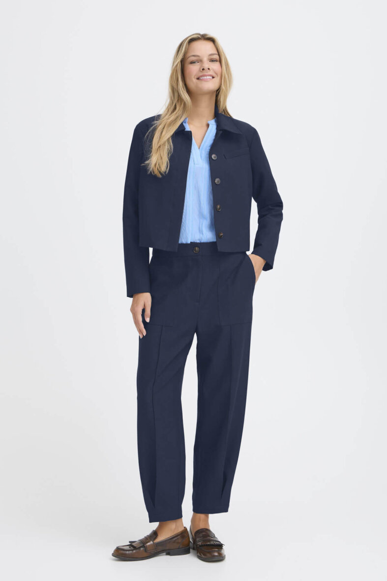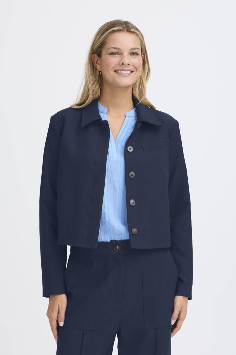 FRANSA blazeren er et elegant og moderne valg, der tilfører et stilrent udtryk til garderoben. Den har et klassisk snit med krave og en flot, mørkeblå farve, som gør den nem at style til både hverdag og mere formelle anledninger. Det korte design giver et nutidigt look og passer perfekt til højtaljede bukser eller nederdele.