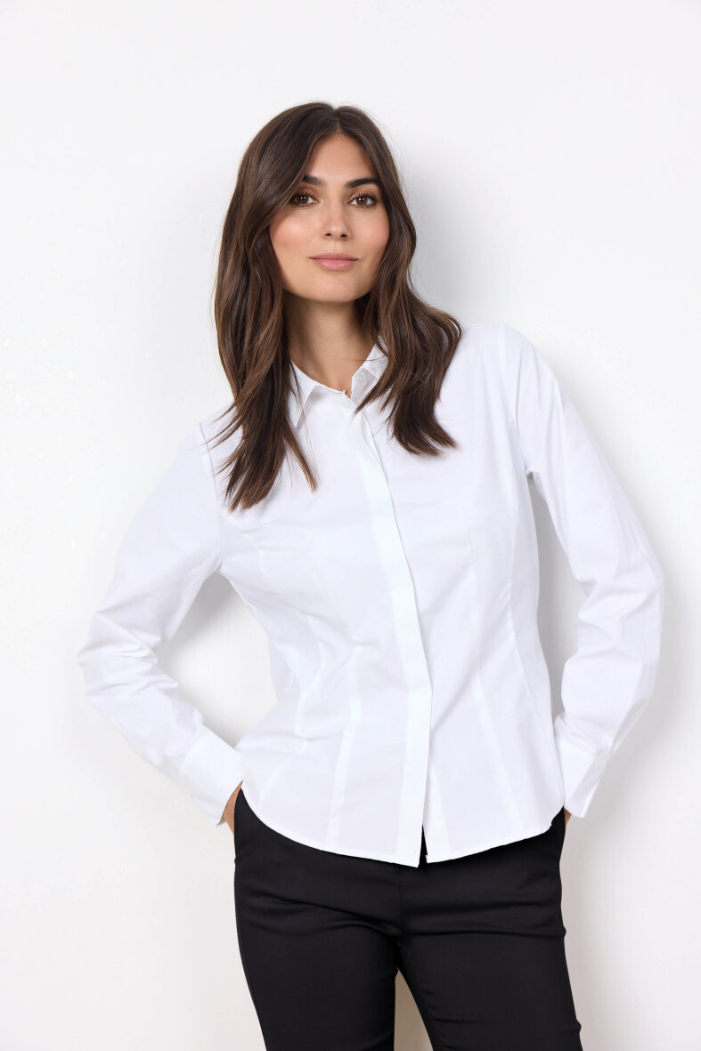 Klassisk hvid skjorte fra Soyaconcept. Hvide skjorter er en uundværlig klassiker i enhver basisgarderobe. De har et enkelt og stilrent udtryk samt en pasform, der klæder de fleste. Brug skjorten til hverdag med et par jeans for et afslappet look, eller style dem med en blazer for et mere elegant og formelt udtryk. En hvid skjorte er en tidløs favorit, som du kan bruge sæson efter sæson.