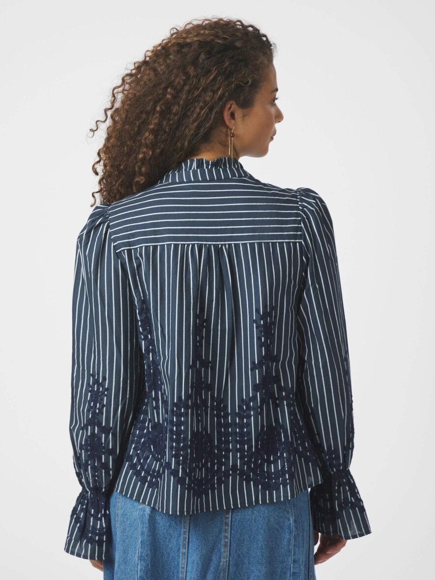 Neo Noir bluse i modellen AMARA. En mørkeblå bluse med hvid stribet design og det fineste broderingsmønster, som tilfører et moderne og stilfuldt udtryk. Blusen er med rund hals med høj flæsekant og v-halsudskæring. De lange ærmer afsluttes med elastikkant og skaber en flot effekt på ærmet. AMARA blusen er lavet i en let bomuldskvalitet.