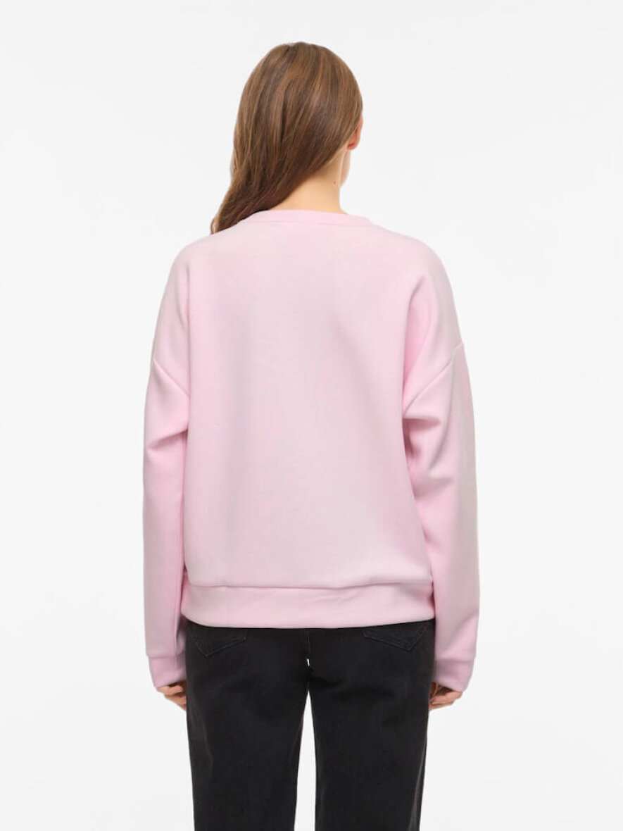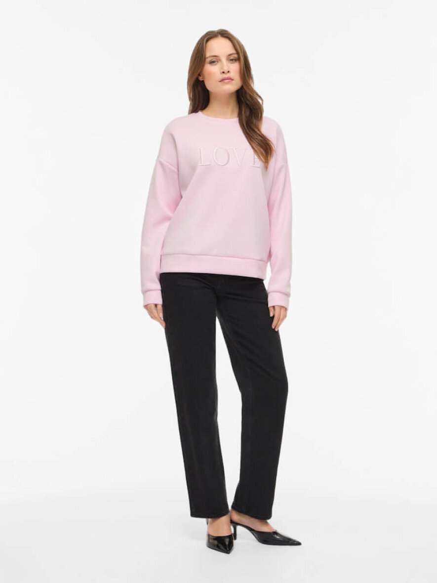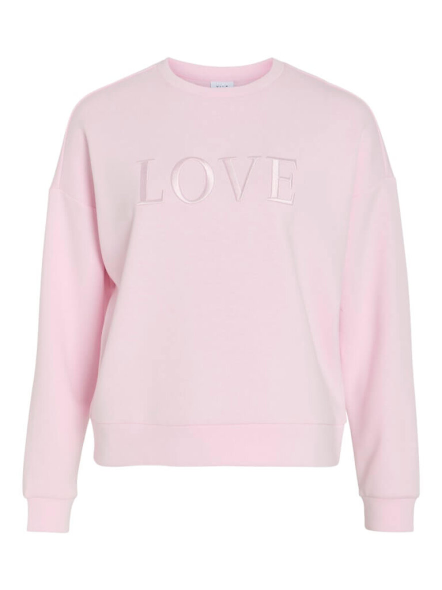 VILA sweatshirt i en flot lyserød farve. Sweatshirten er med broderet "LOVE" tekst på fronten i matchende lyserød, som giver en diskret detalje til designet samt struktur.