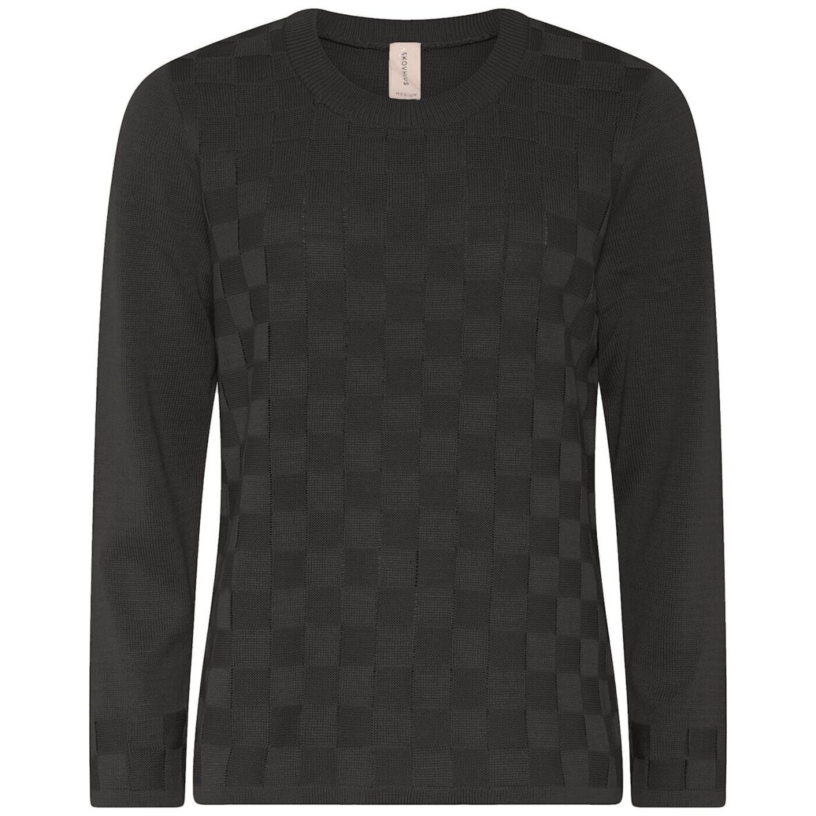 Skovhuus striktrøje i en en flot mørkegrå farve. Strikken er med et fint og enkelt firkantet mønster på fronten.