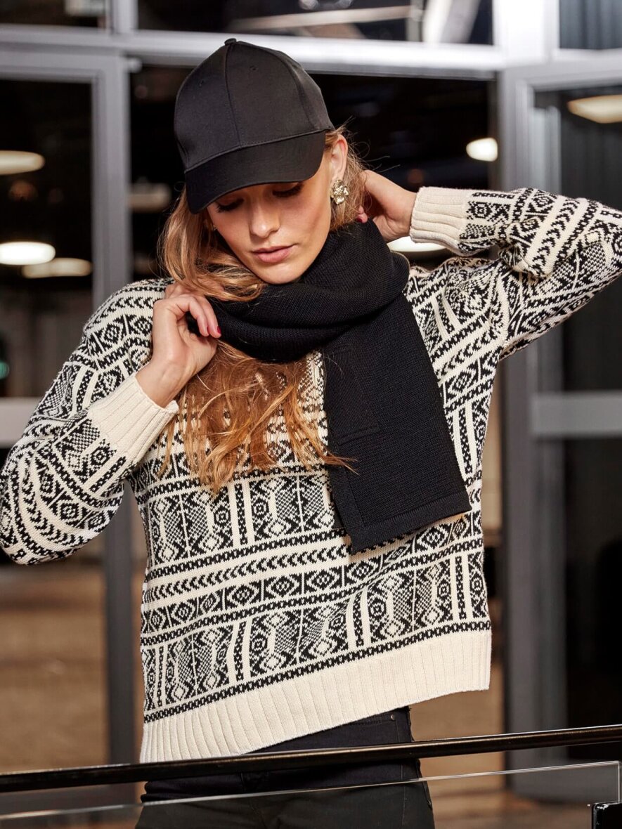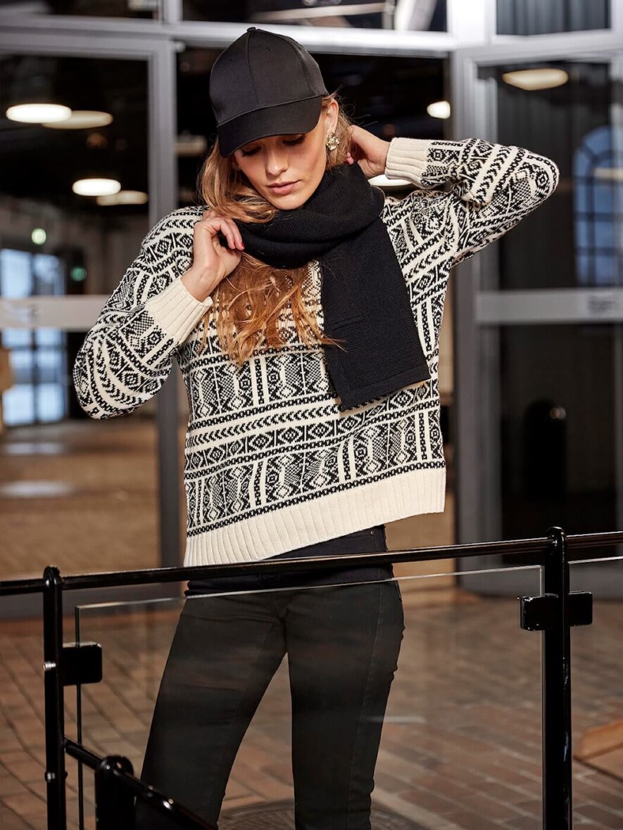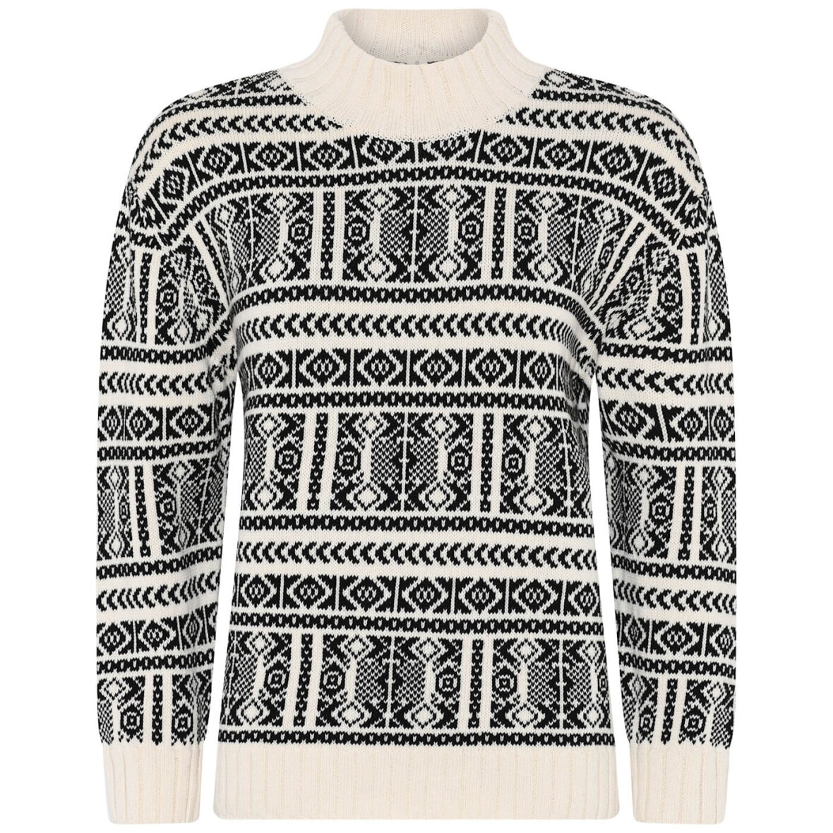 Skovhuus striktrøje i en flot cremefarvet base og sort vævet mønster. Strikken er med høj hals og lange ærmer, med bred ribkant ved alle åbninger.