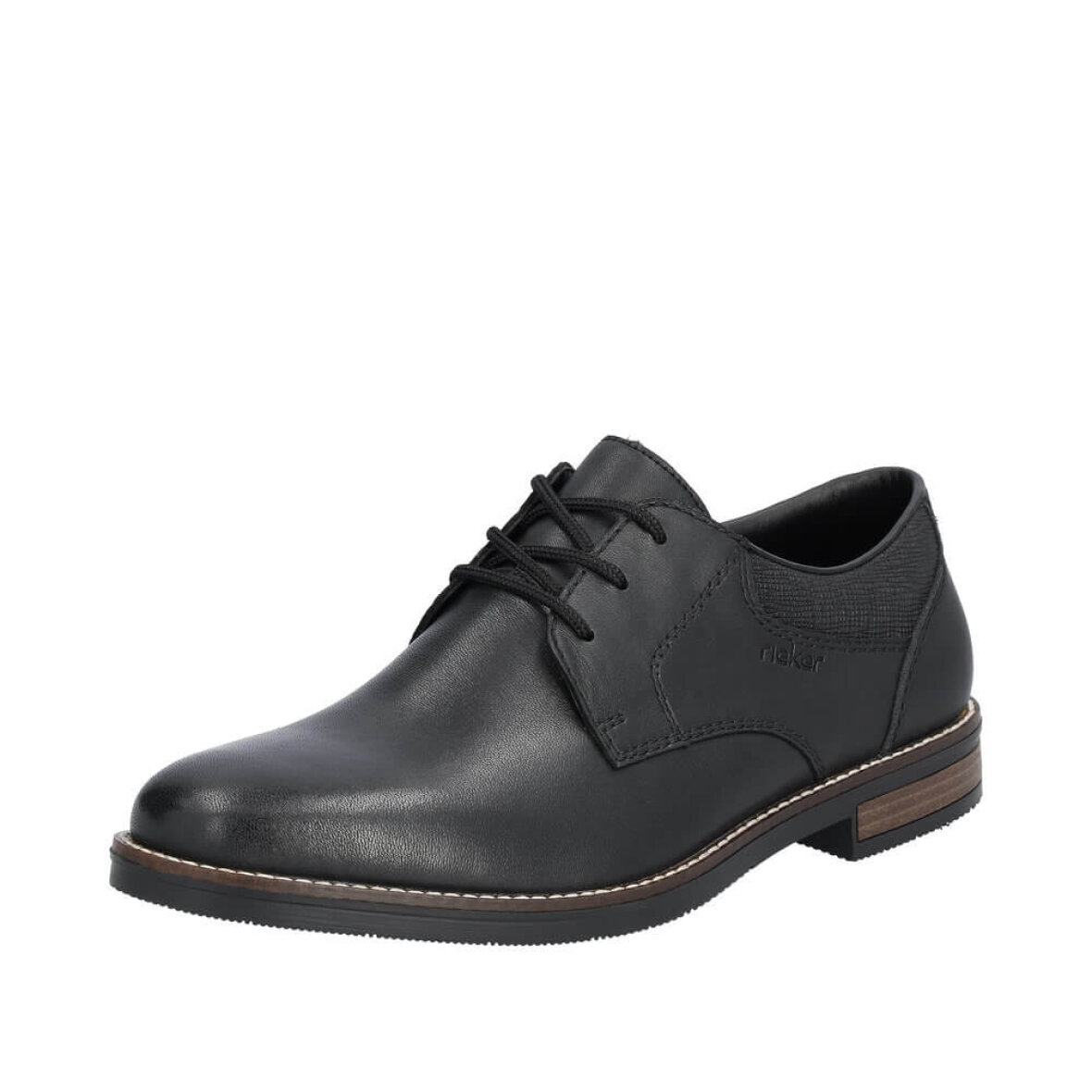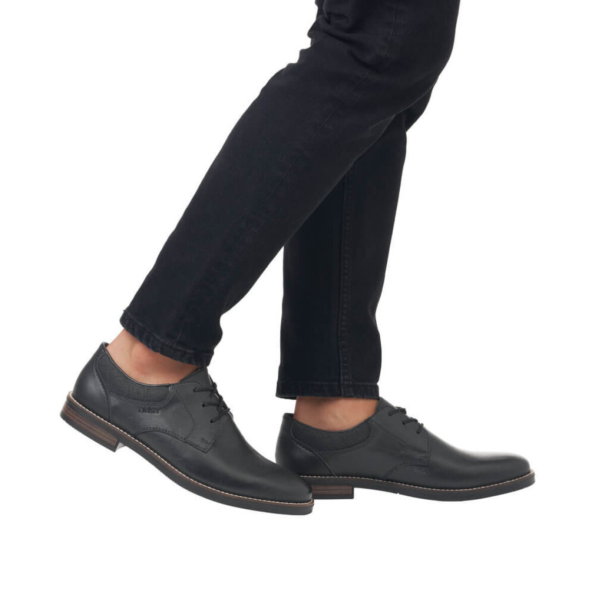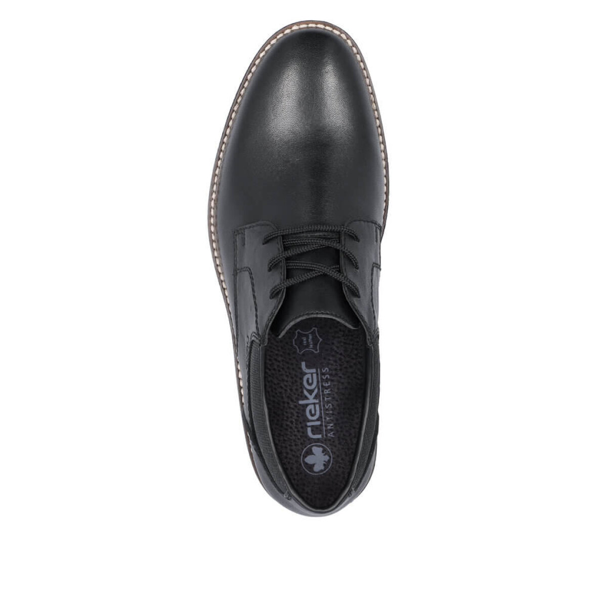 Stilfuld og klassisk herresko fra Rieker. Skoen er lavet i sort glat skind med snørelukning, som sikrer en god individuel pasform. Herreskoen er med fine detaljer med struktureret imiteret skind detaljer ved åbningen.