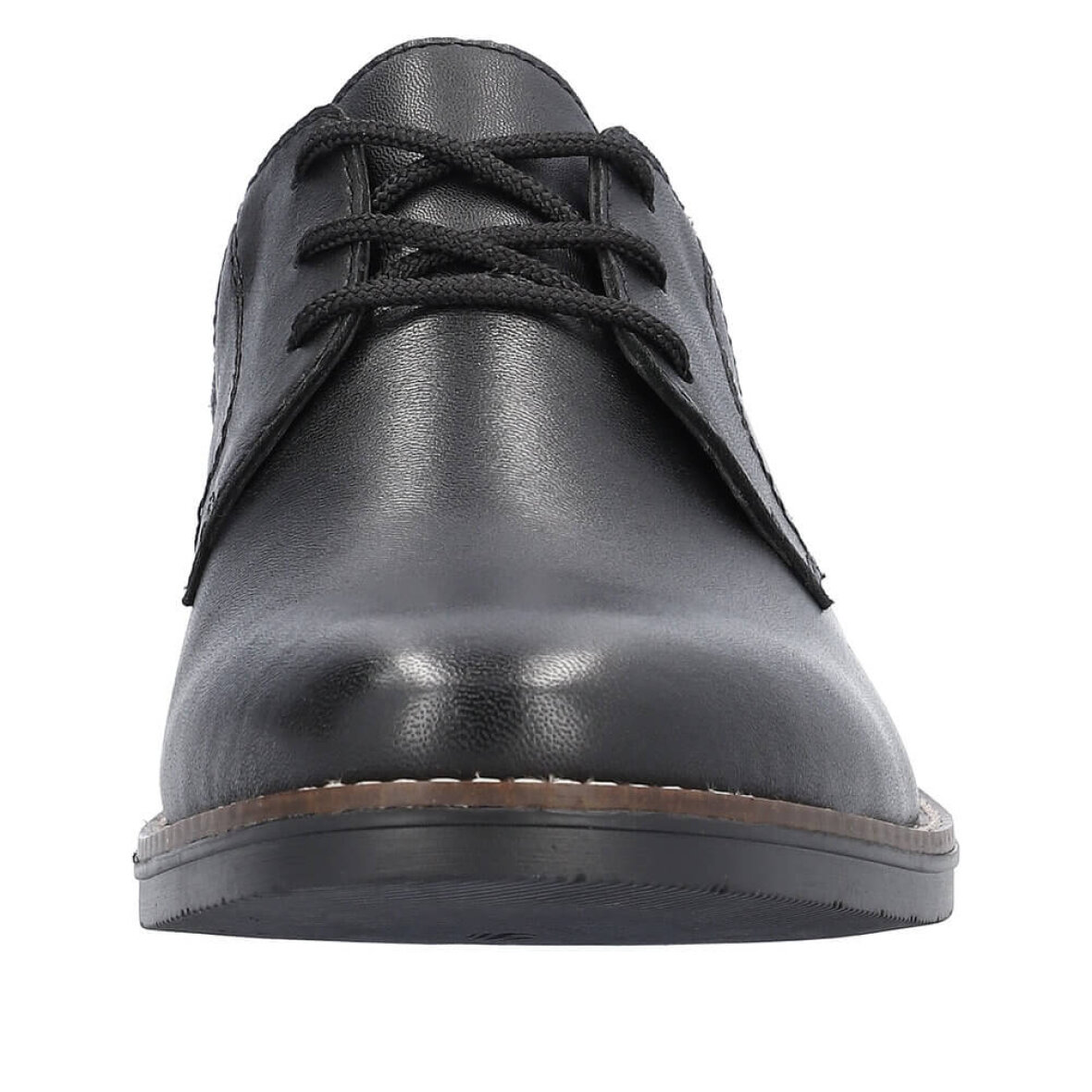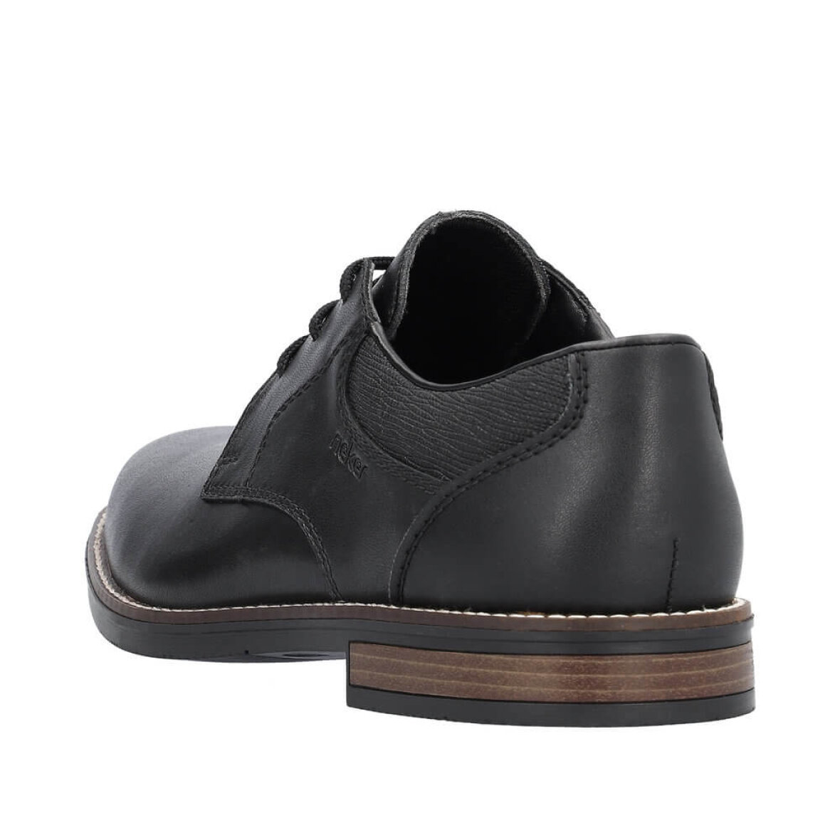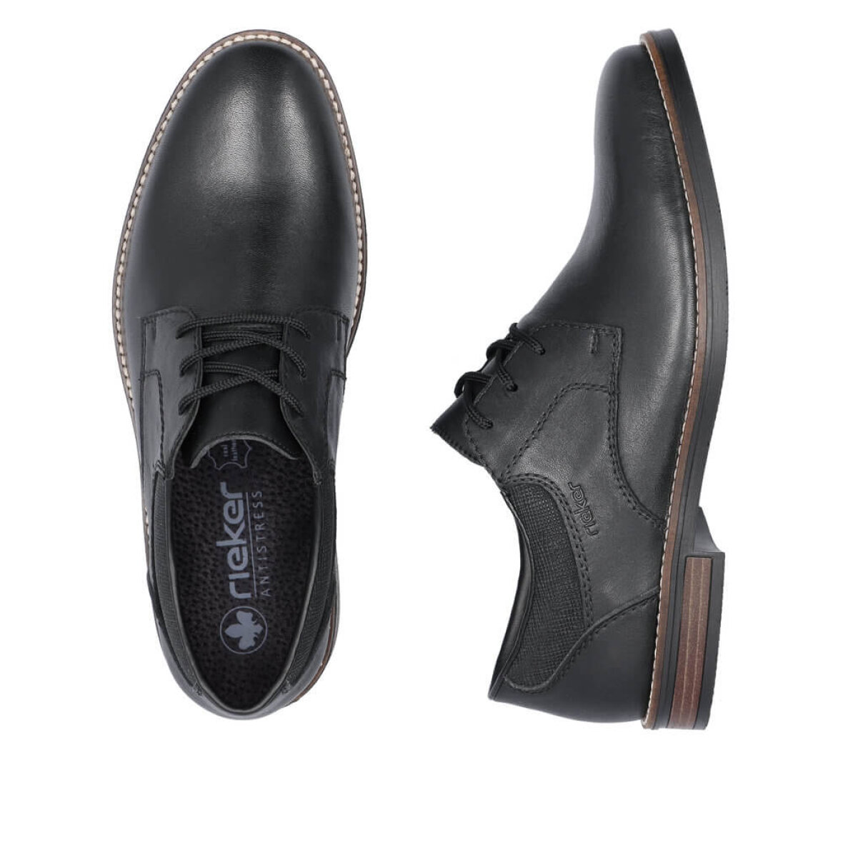 Stilfuld og klassisk herresko fra Rieker. Skoen er lavet i sort glat skind med snørelukning, som sikrer en god individuel pasform. Herreskoen er med fine detaljer med struktureret imiteret skind detaljer ved åbningen.
