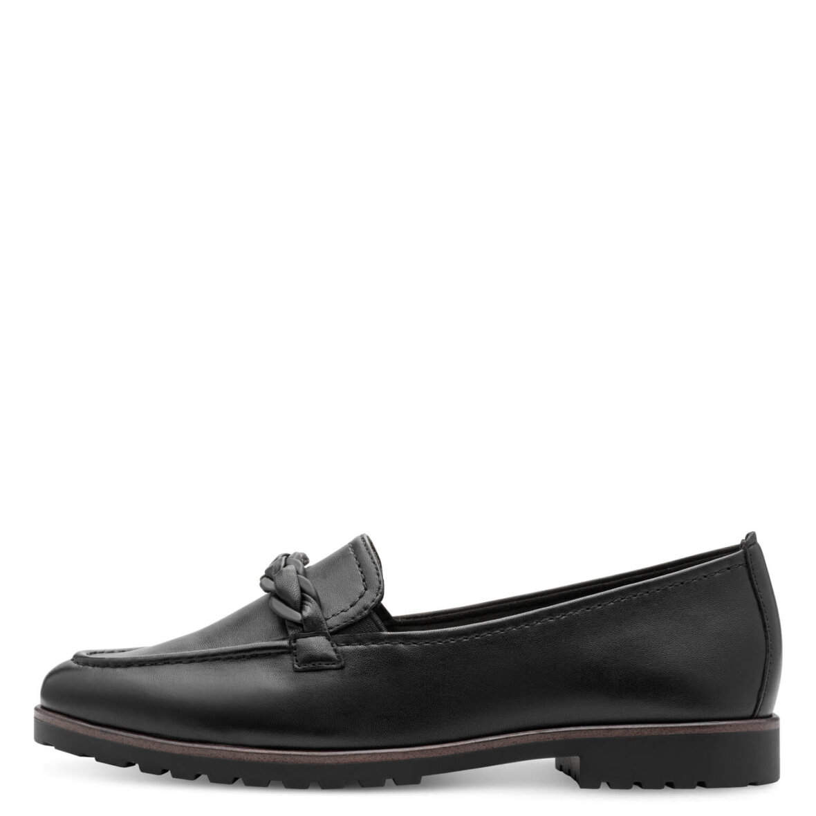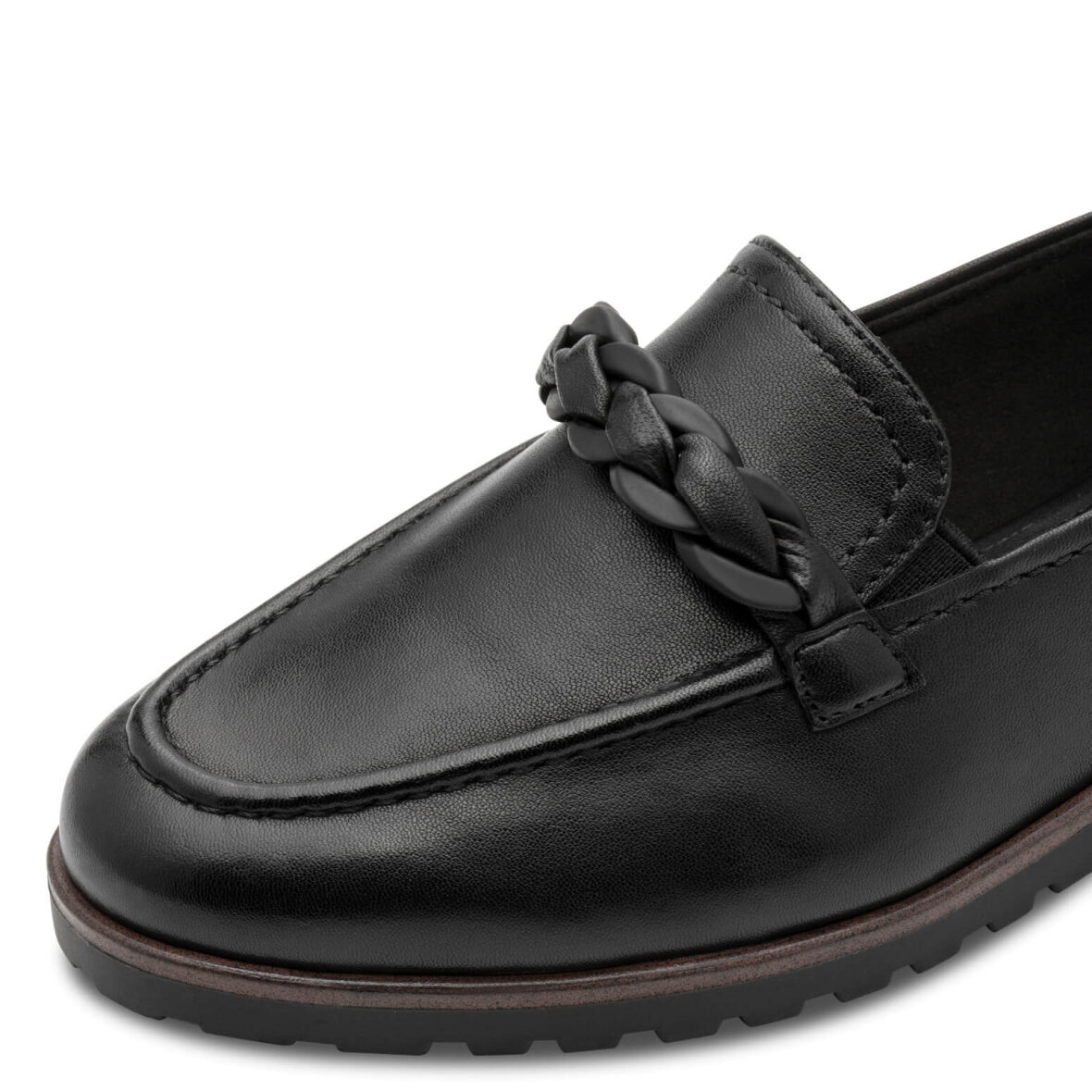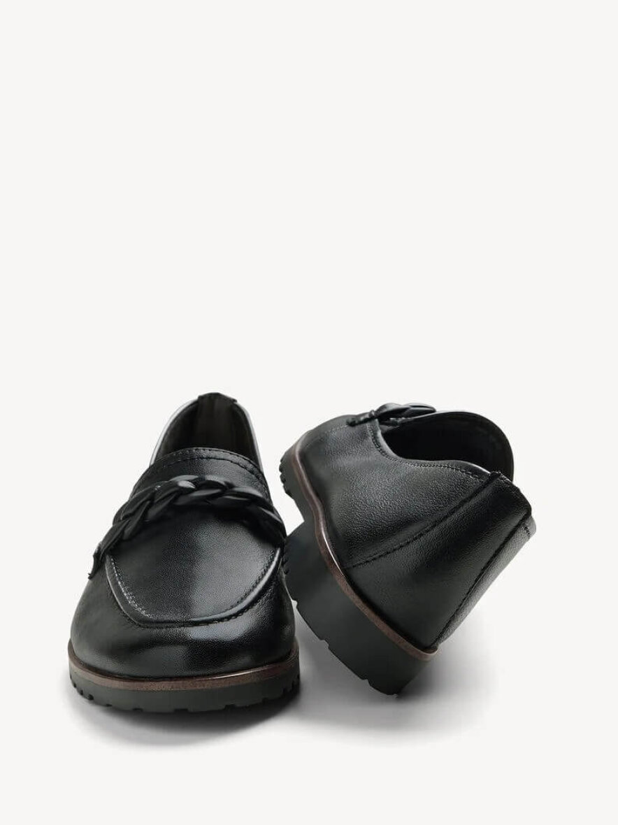Stilfulde sorte loafers fra Tamaris i glat skind med en dekorativ rem detalje over forfoden, der tilføjer skoen et eksklusivt look.