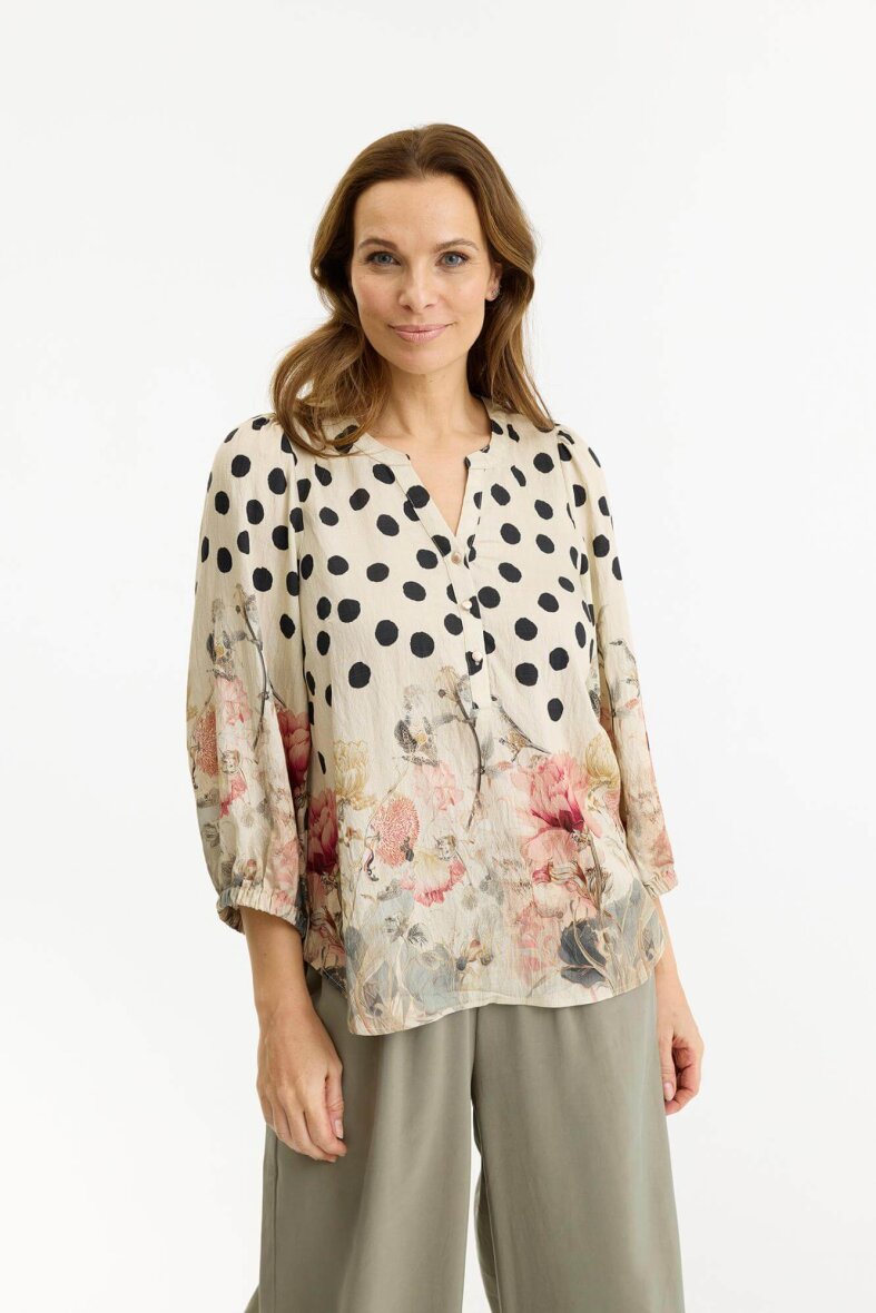 In Front bluse i modellen Pauline. En smukt cremefarvet bluse med prikket mønster på blusens øverste del og smukt dekoreret med med blomster print med fugle. Det smukke og rolige blomst- og fuglemotiv fortsætter i et stort ryg print, som tilføjer et feminint og unikt touch til designet.