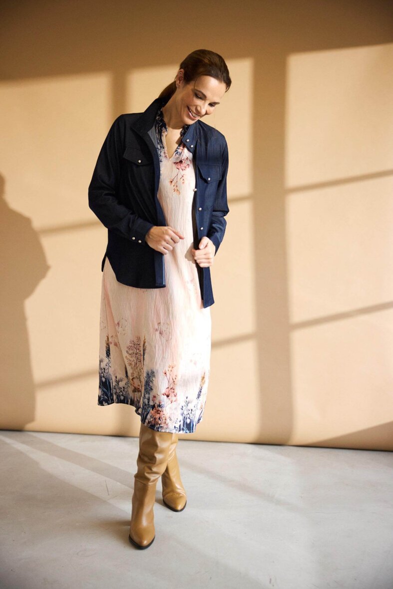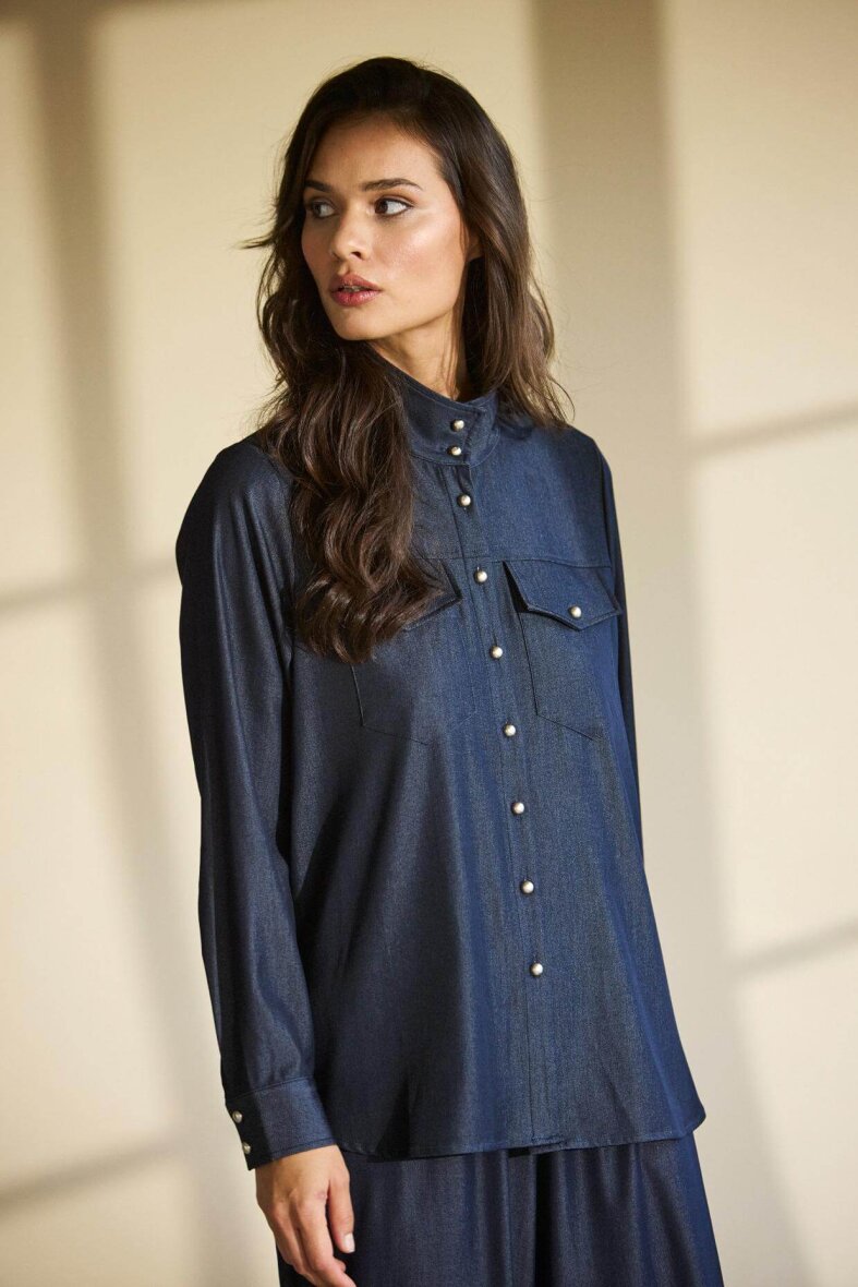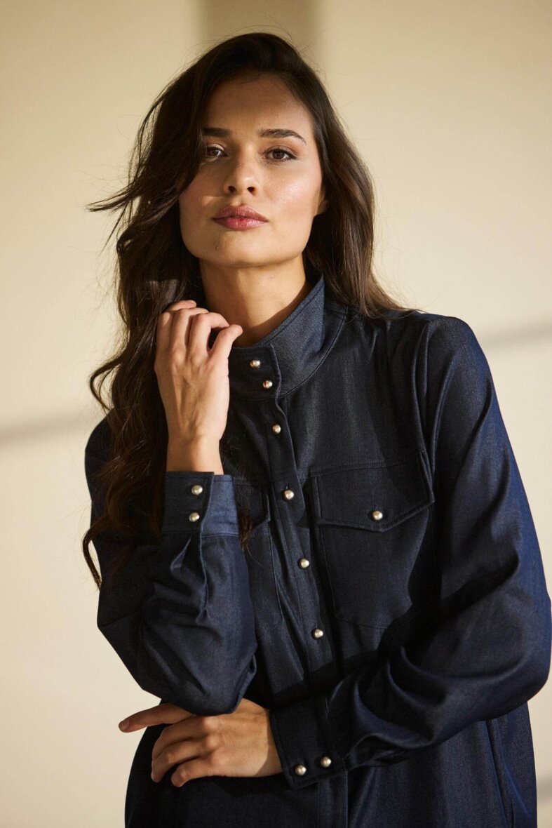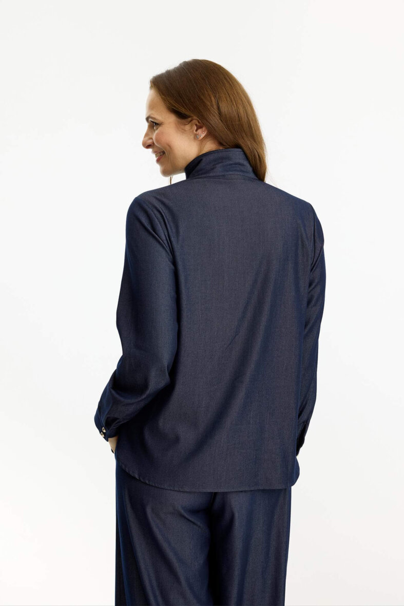In Front skjorte i mørkeblå denim look. Hannah skjorten er med høj hals og markante knapluk langs fronten. De lange ærmer er med manchet knapluk og brystlommer med knapluk.