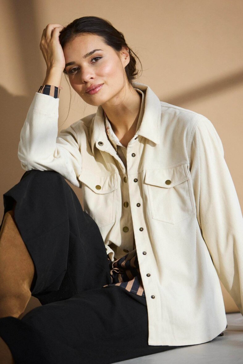 In Front jakke i en flot lys cremefarve i en blød fløjlskvalitet med let struktur. Jakken lukkes med trykknapper langs fronten.