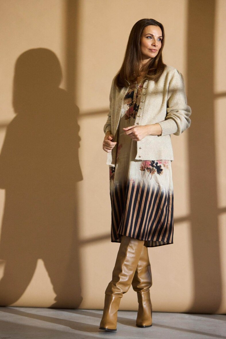 In Front kjole i modellen Berta i en sandfarvet base og et smukt mix af prints.