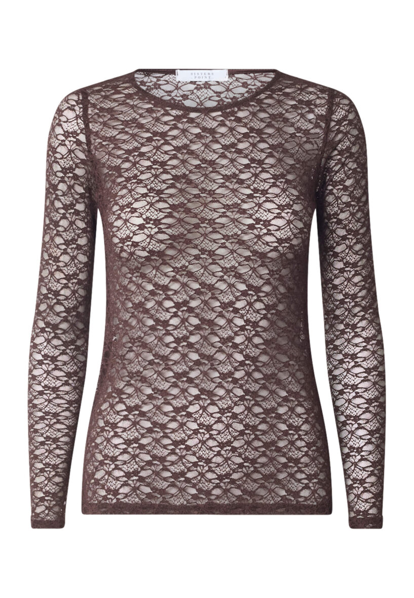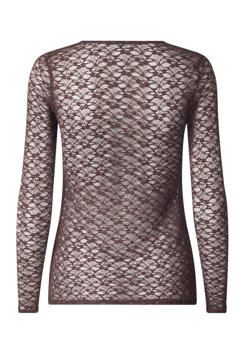 Det mørkebrunt blondemønster, der giver et sofistikeret og moderne udtryk. Blusen er med rund hals og lange ærmer.