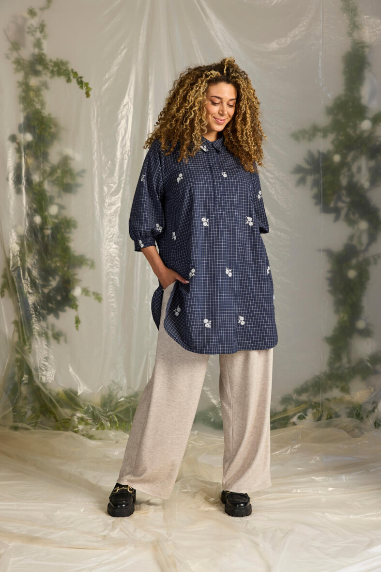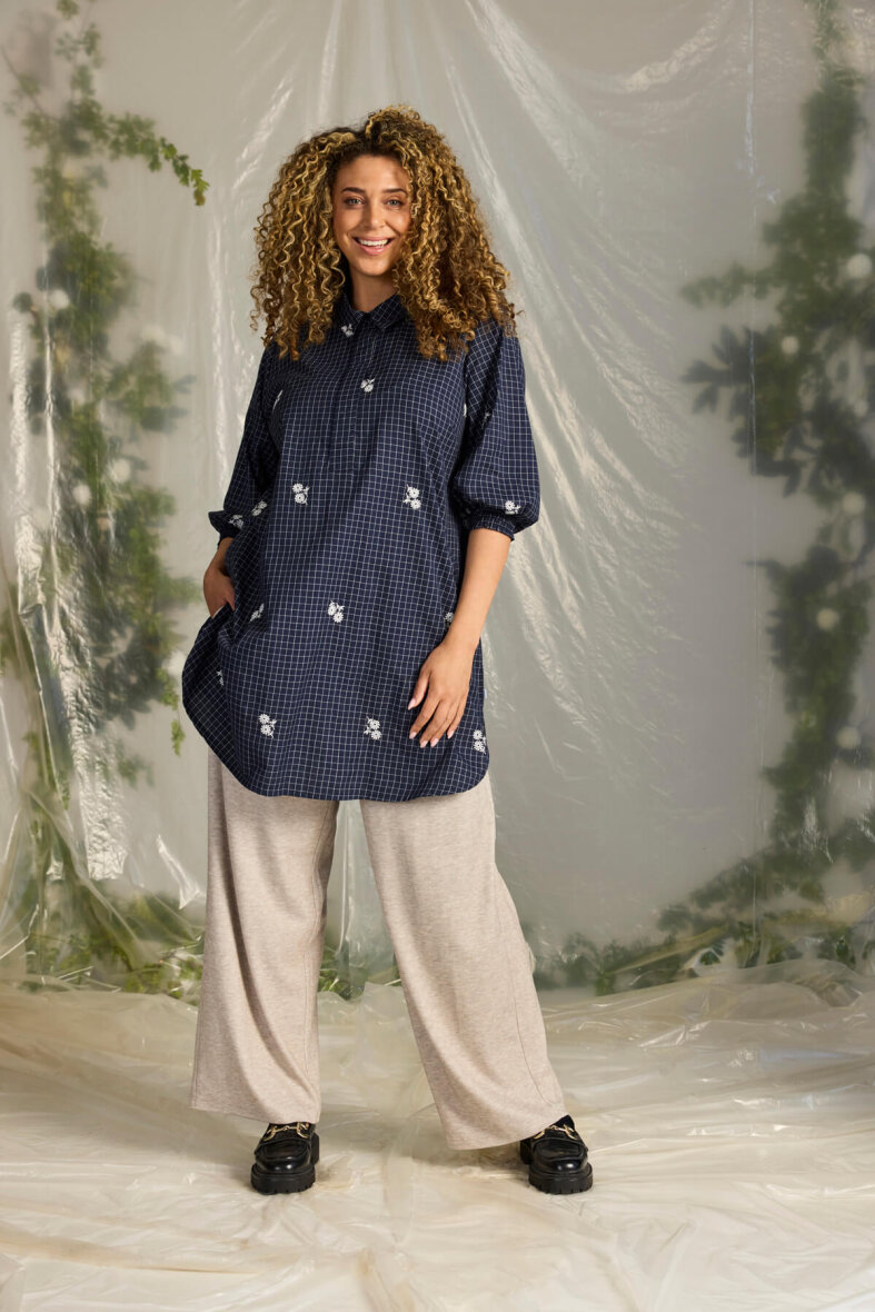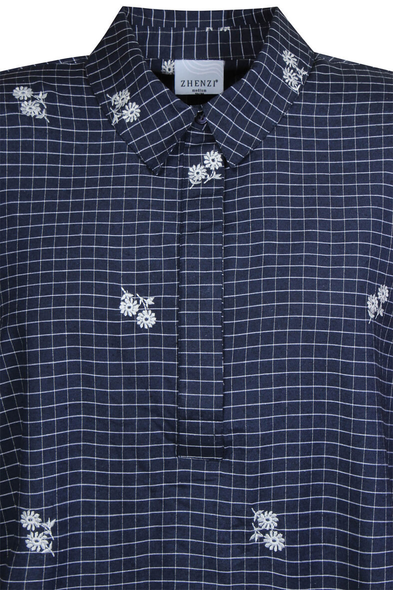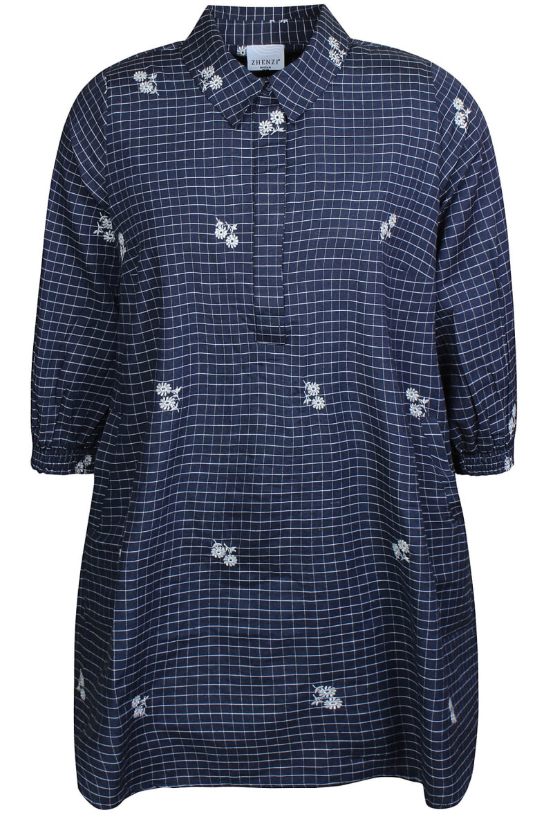 Zhenzi kjole/tunika i et blå ternet print og fine broderingsdetaljer med blomster.