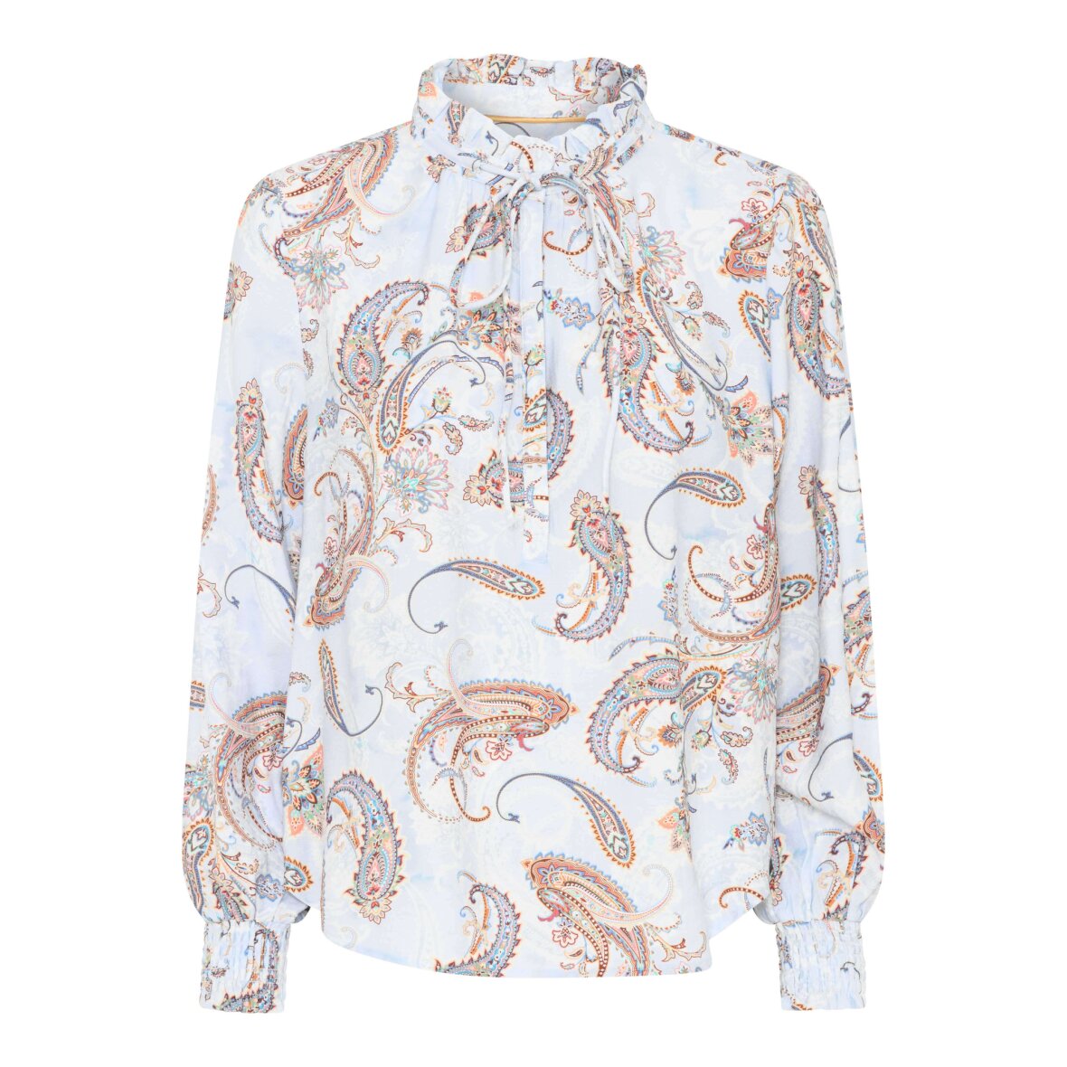 Lyseblå Soulmate bluse med et fint multifarvet paisley print. Blusen er med rund hals med kina krave og flæser samt stolpeluk med knaplukning foran.