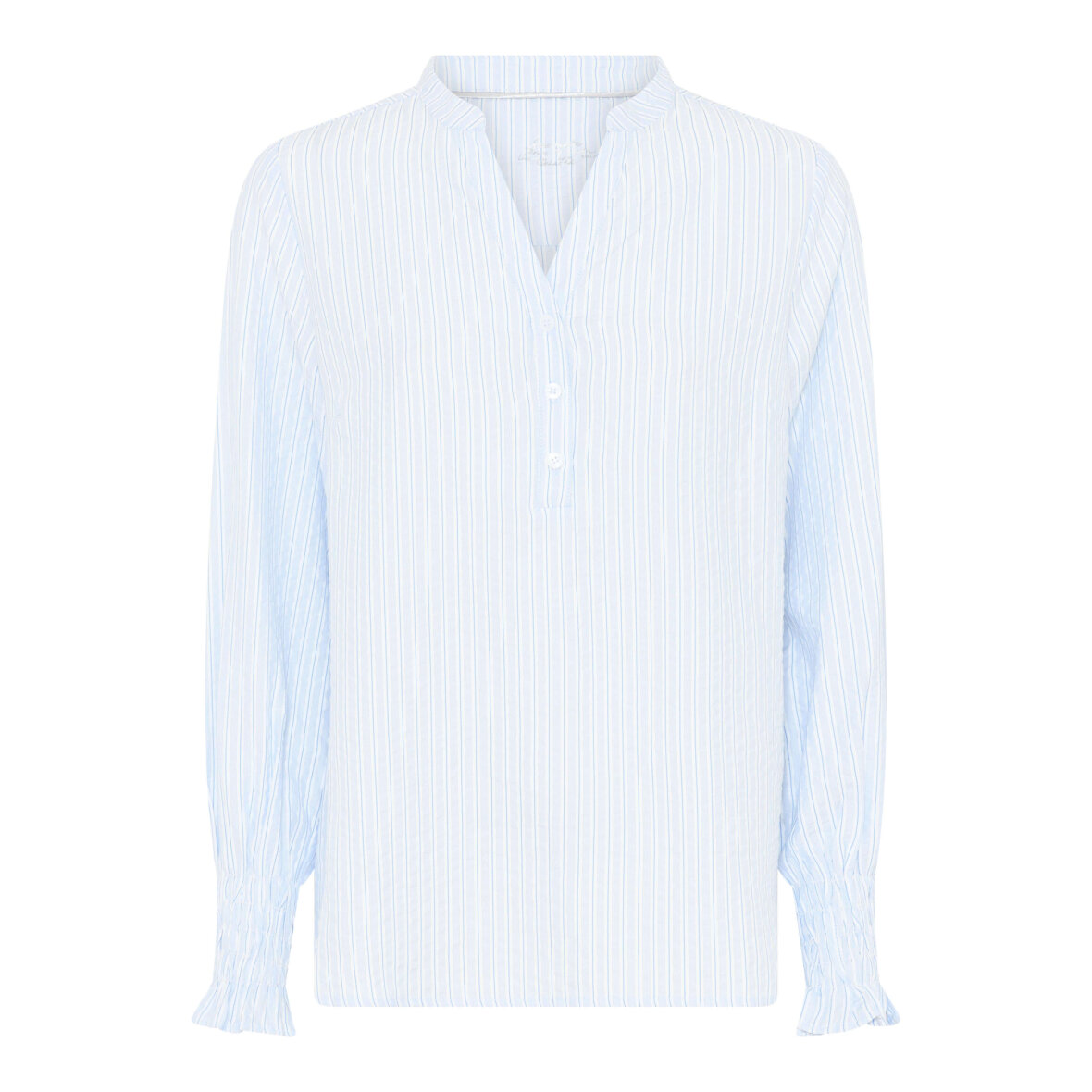 Blusen er med v-halsudskæring, tre knapper og stolpeluk. Blusens lange ærmer er med smockkant ved håndleddet og en lille flæsekant, for et feminint touch til designet.