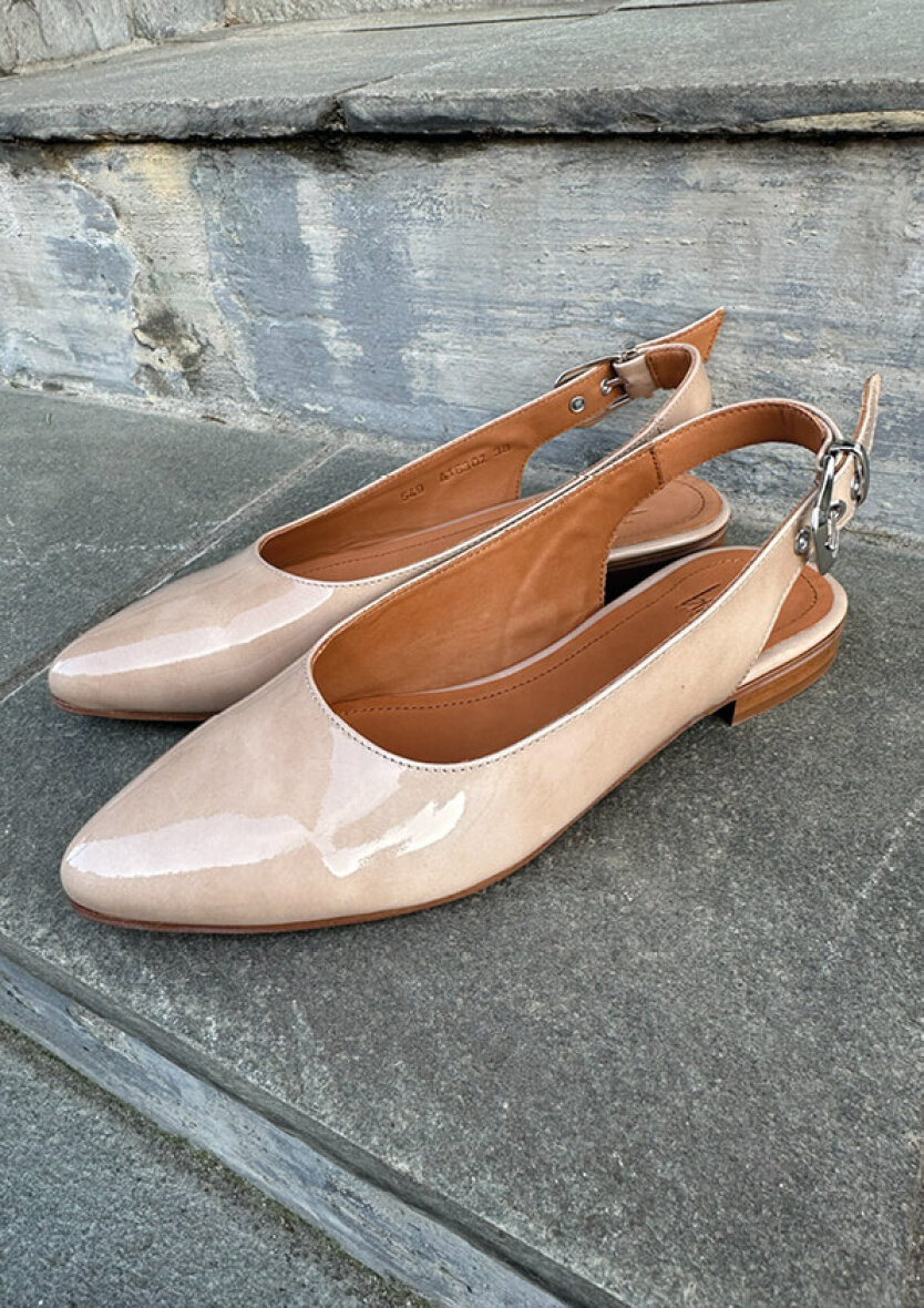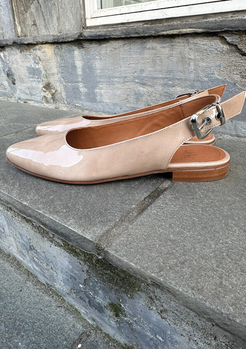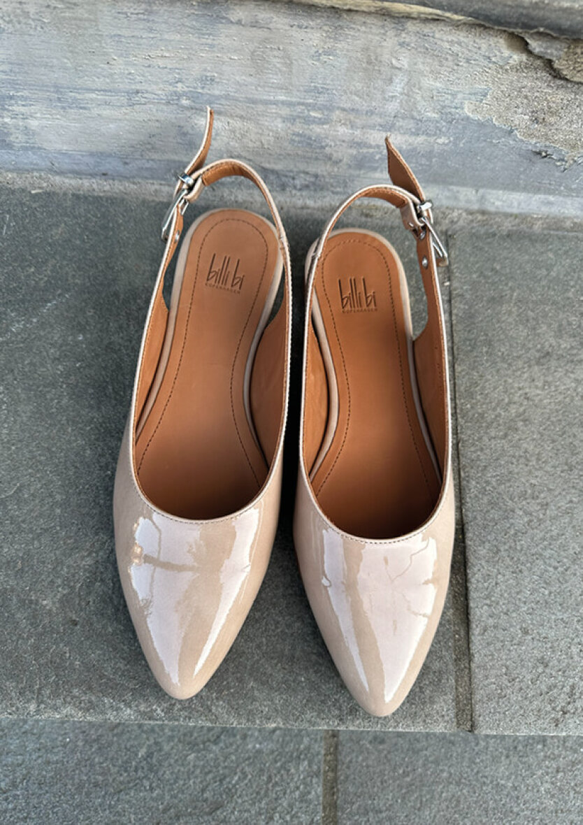 Fine håndlavet slingbacks fra Billi bi i en skøn beige farve. Skoen er udført i beige lakeret skind i et stilfuldt og elegant design med spids snude.