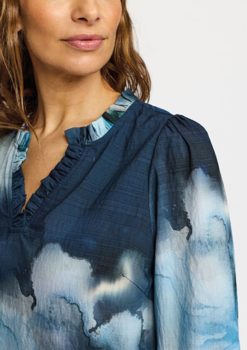 2-biz bluse i modellen EPEL. Blusen er lavet i et smukt grafisk print i blå nuancer.