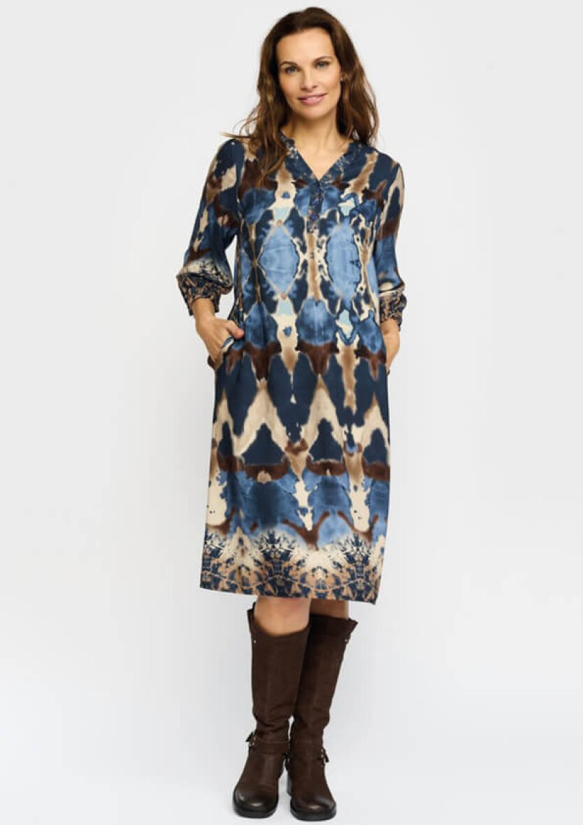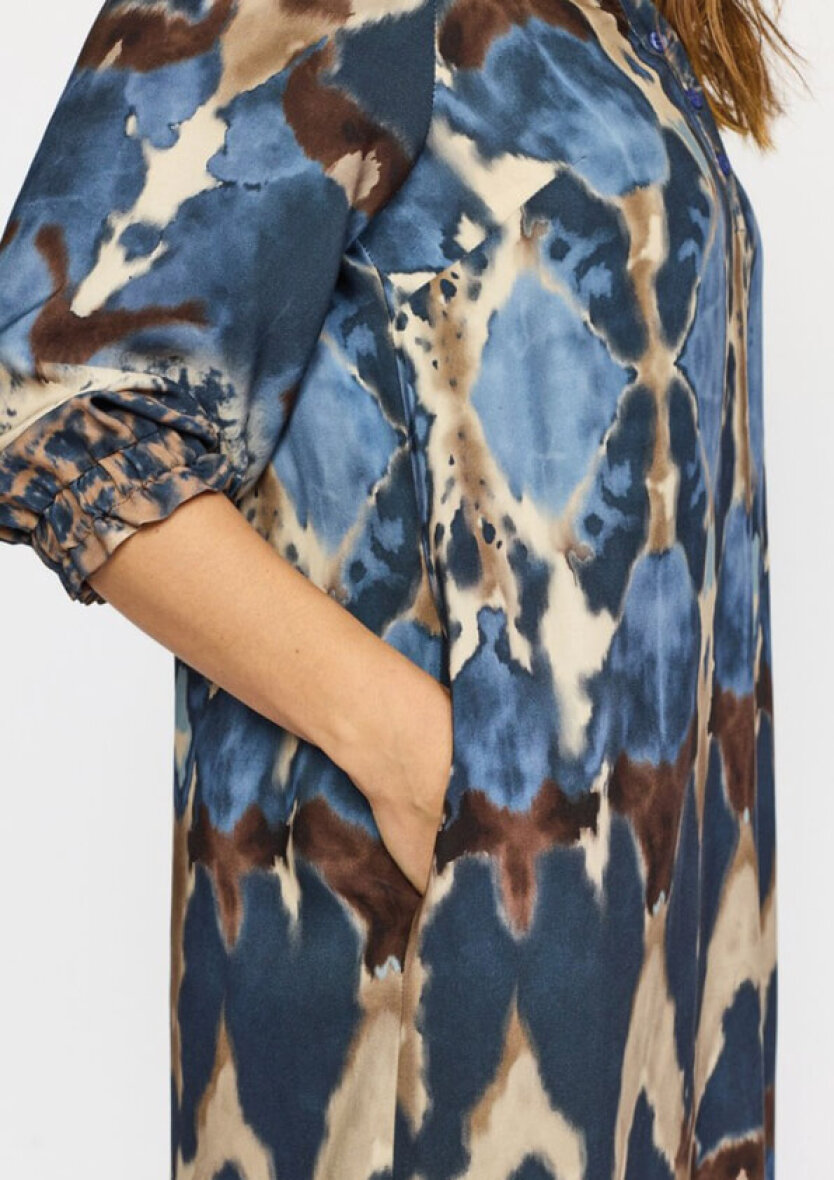 Det smukke grafiske print i blå, brune og beige nuancer tilføjer karakter og kant. Kjolen er med v-halsudskæring, som fortsætter i knapper og stolpeluk. De 3/4 lange ærmer er med elastikkant og en lille flæsekant, som skaber en fin poset effekt, der giver et feminint og afslappet udtryk.