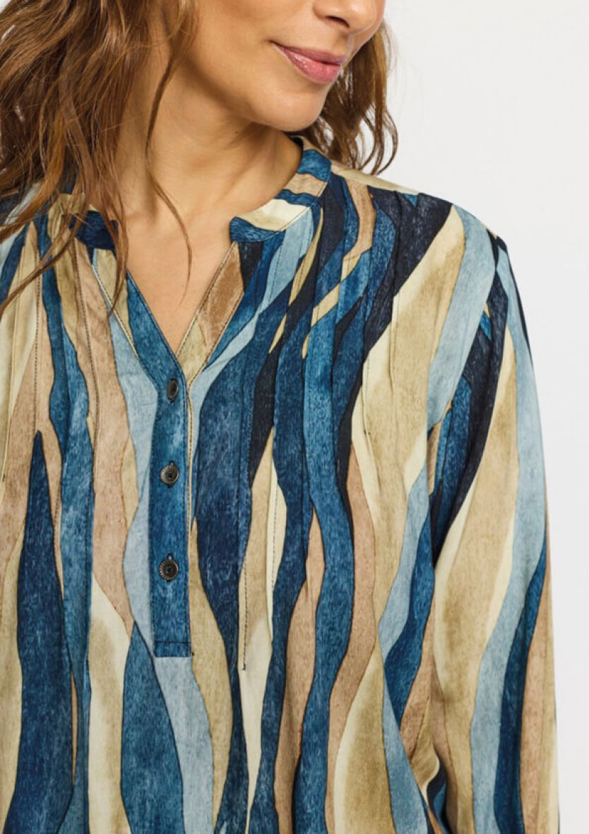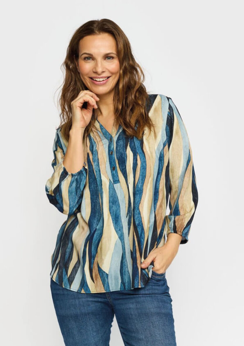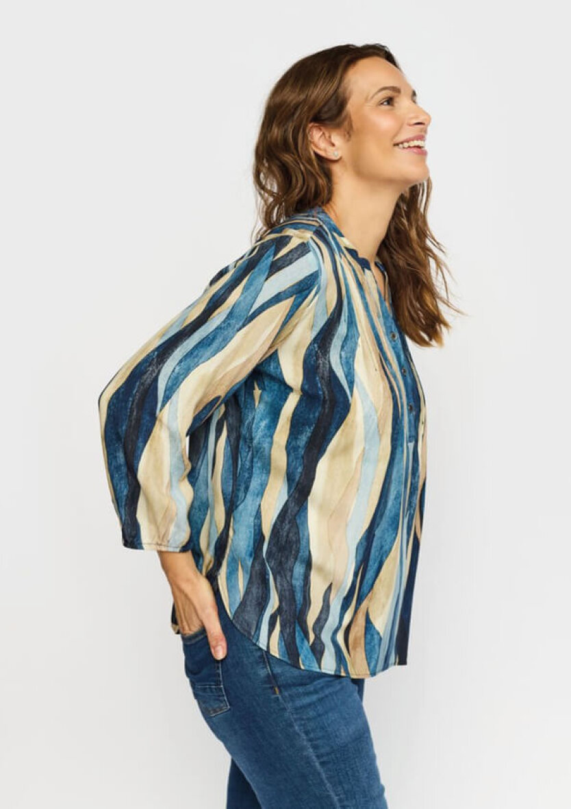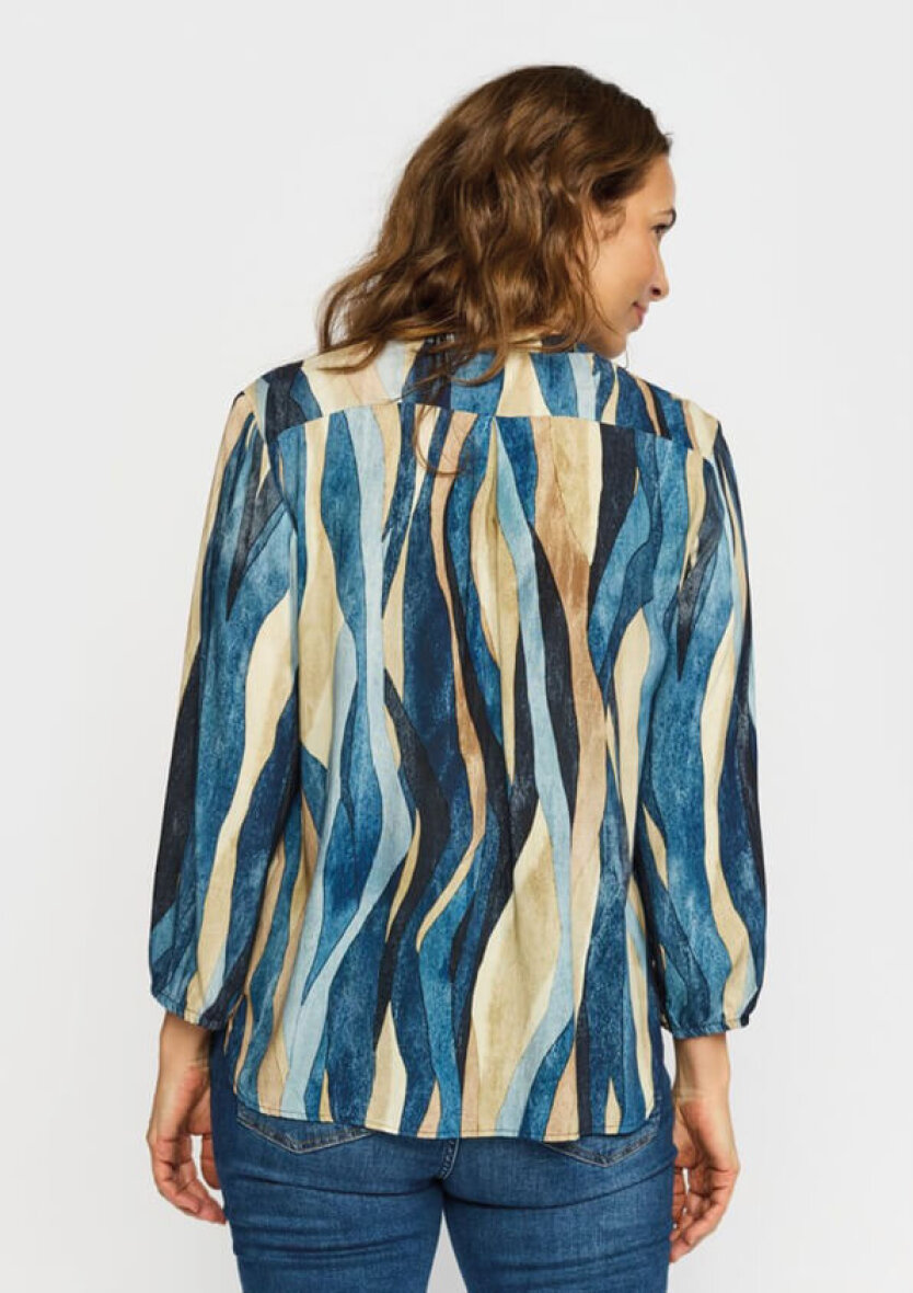 2-biz bluse i den populære model DORTE. Blusen er lavet i det flotte bølget print i en smuk farvekombination af blå og sandfarvet nuancer.