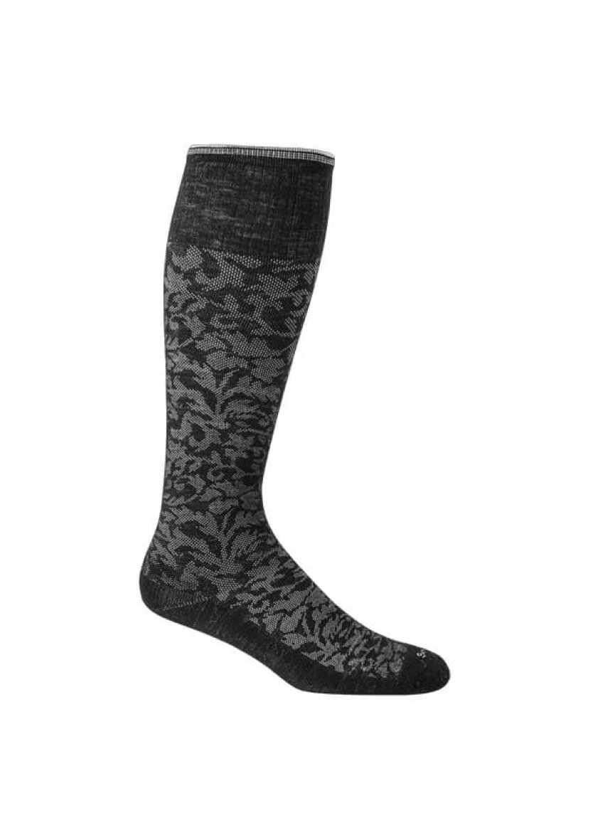 Sockwell i modellen "Damask" er en sort mønstret kompressionsstrømpe med klasse 1-kompression, designet til at give let og behagelig støtte i hverdagen.