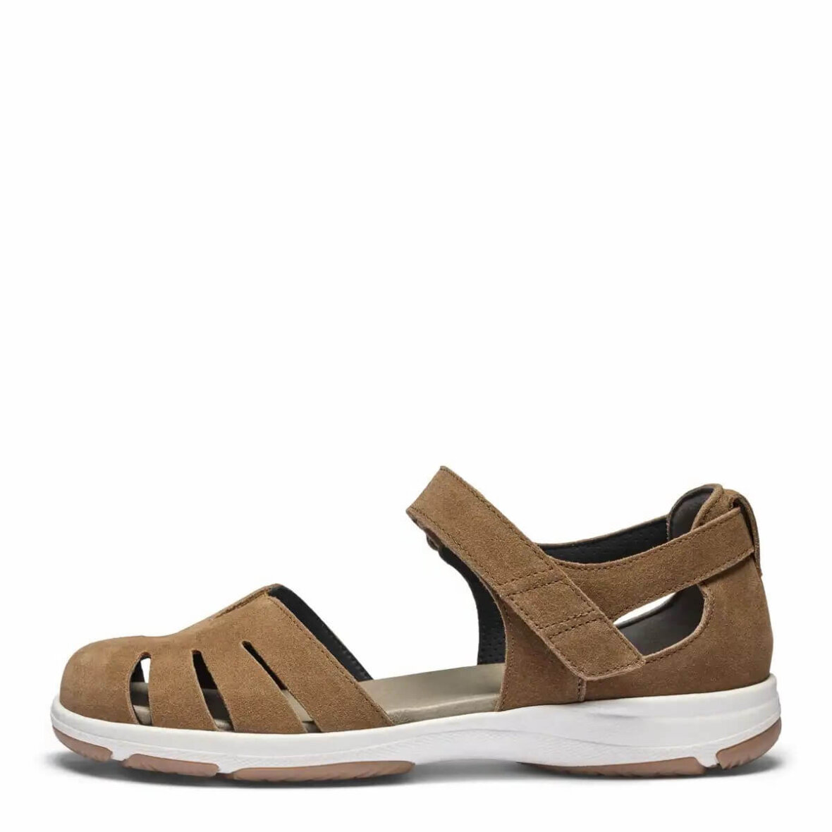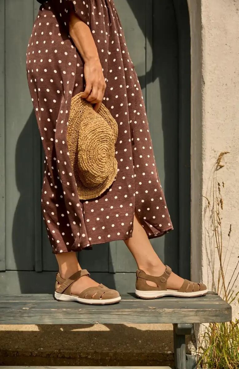 Den brune lukket sandal har nem tilpasning til den individuelle person. Velcro-remmen der er på sandalen er ekstra lange og kan klippes efter dit behov. De er inddelt i felter og skal du klippe stropperne til skal du blot klippe mellem felterne.
