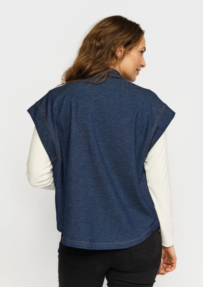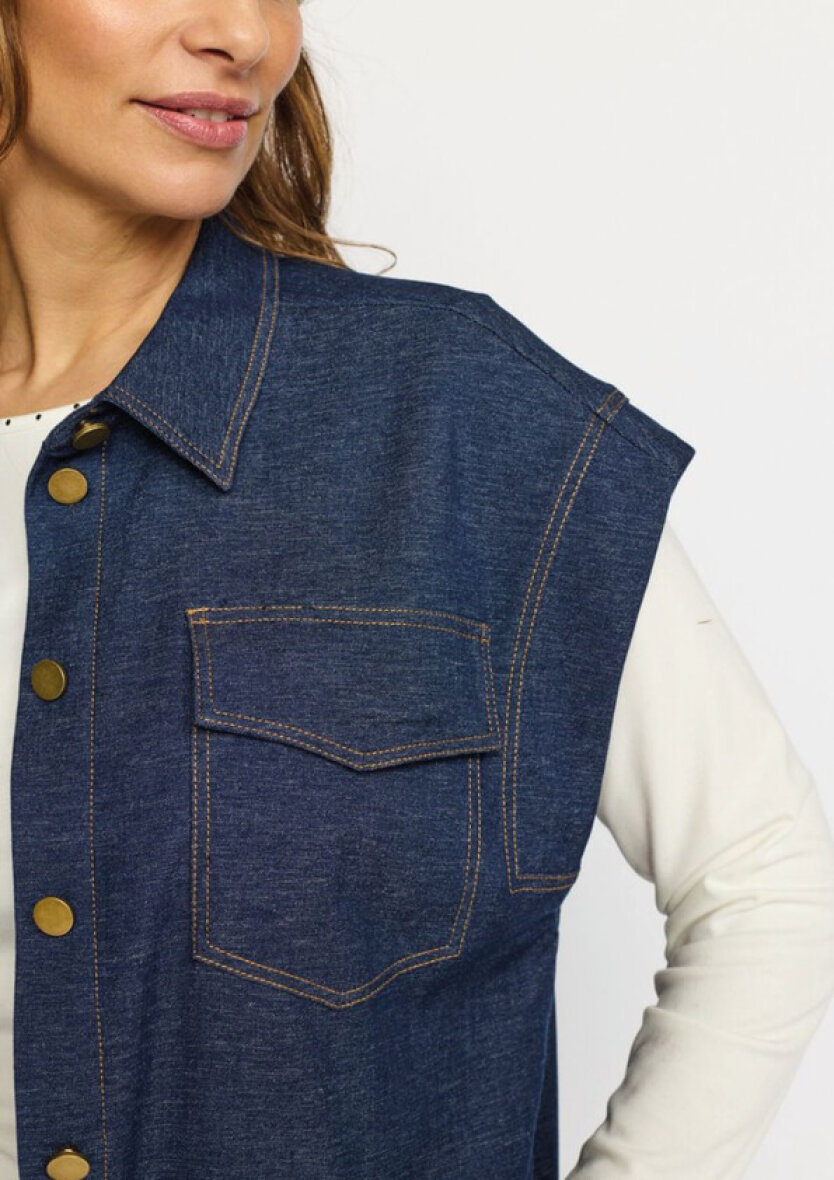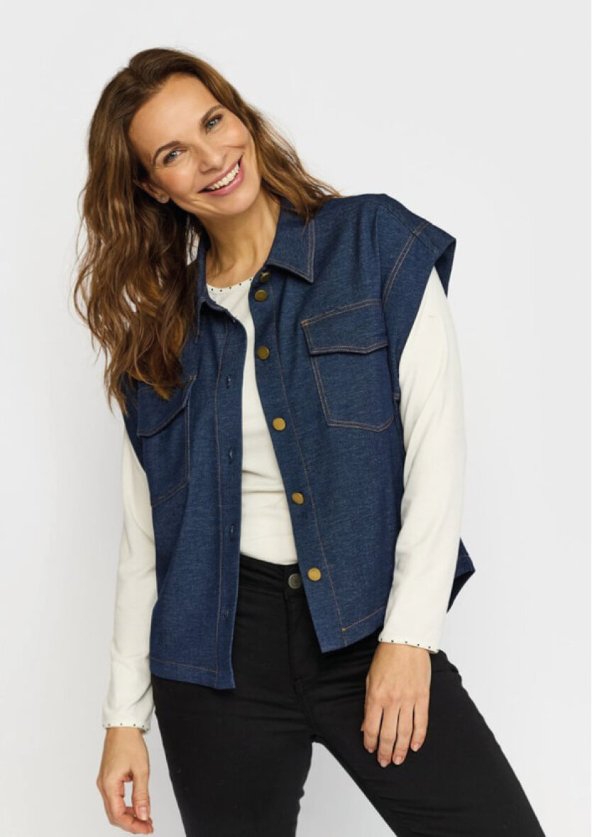 2-Biz vest i et flot og alsidig medium denim look. Vesten er med krave og gennemgående knapper foran. Med brystlommer med knap samt stikningsdetaljer, hvilket giver et fedt look.