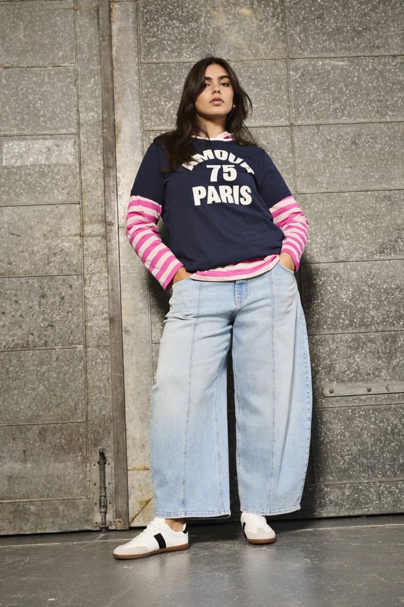 Only Carmakoma t-shirt i en marine blå farve. T-shirten er med hvid citattryk på fronten med ordrerne "AMOUR 75 PARIS" med hvid kontakt kant ved den runde halsudskæring, hvilket er med til at skabe et sporty look.