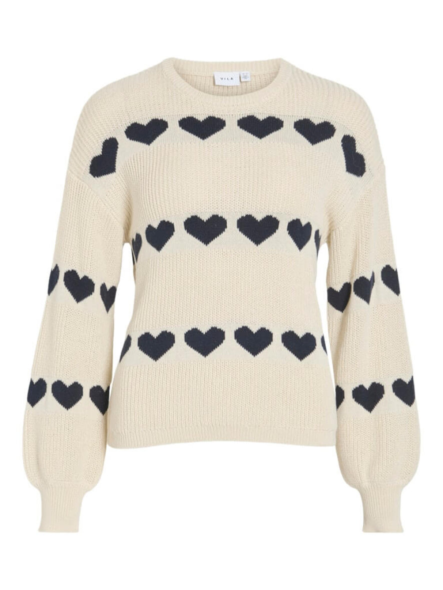 VILA striktrøje i et feminint og tidsløst design med mørkeblå hjerter vævet i designet.