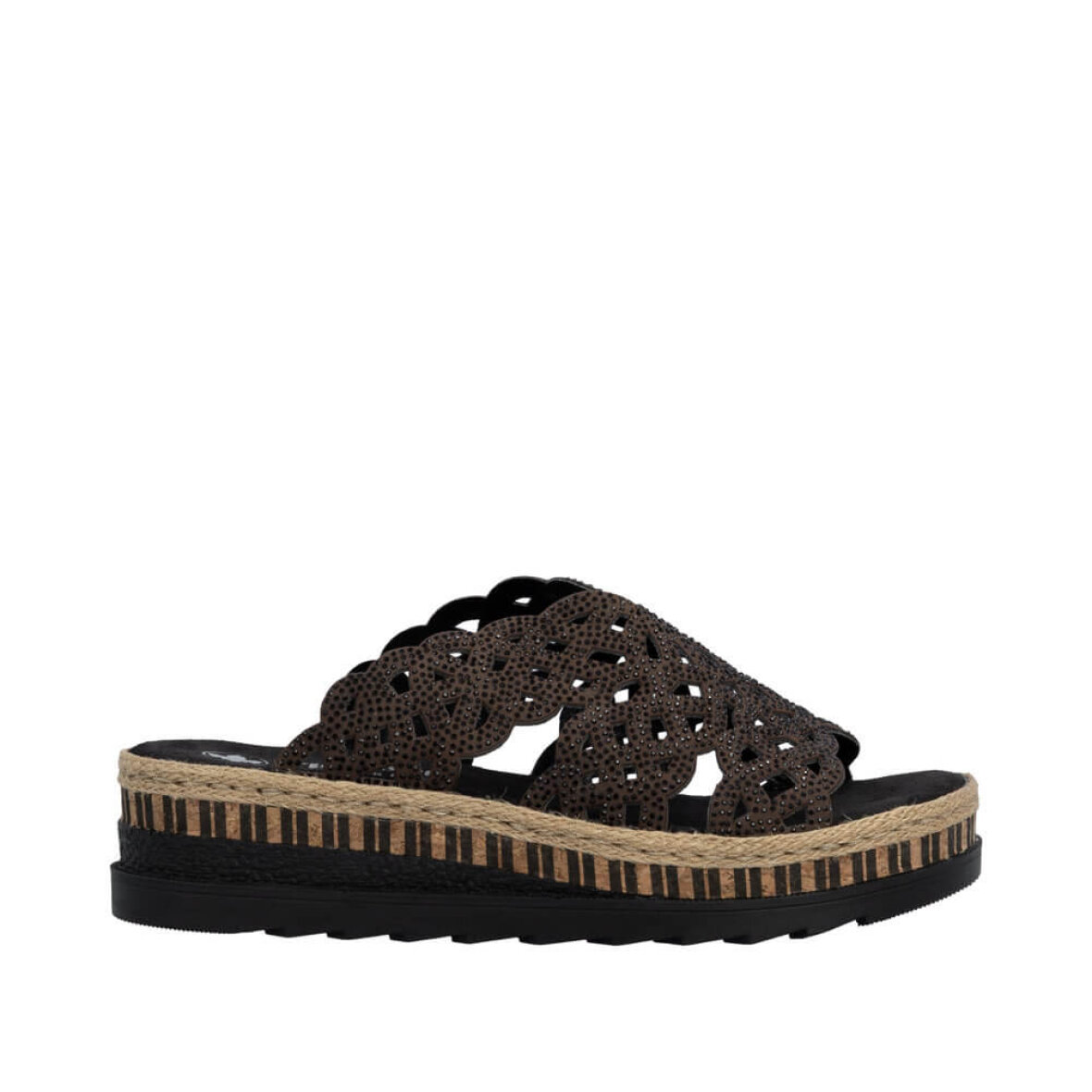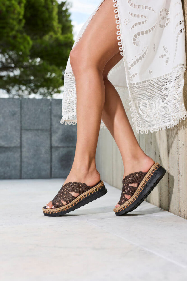 Super flot og feminin slipper sandal til kvinder fra Rieker. Overdelen er lavet i en flot brun farve med små dekorative sten og elegant hullet mønster, som giver et feminint udtryk.