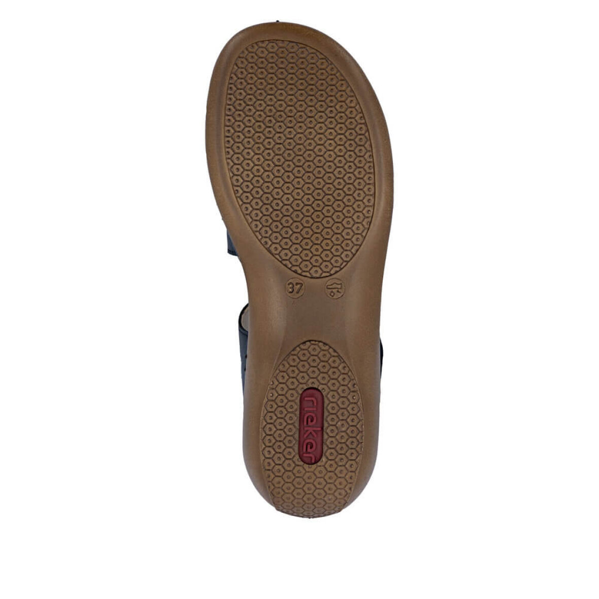 Rieker dame sandal i en flot mørkeblå farve i en populær model. Sandalens overdel er udført i skind med to velcro remme, så den er nem at få af og på samt justere. Indersålen er lavet i Riekers velkendte bløde fodseng i blødt materiale, som gør sandalen komfortabel at have på.