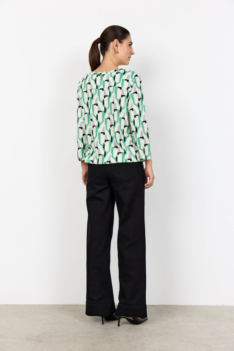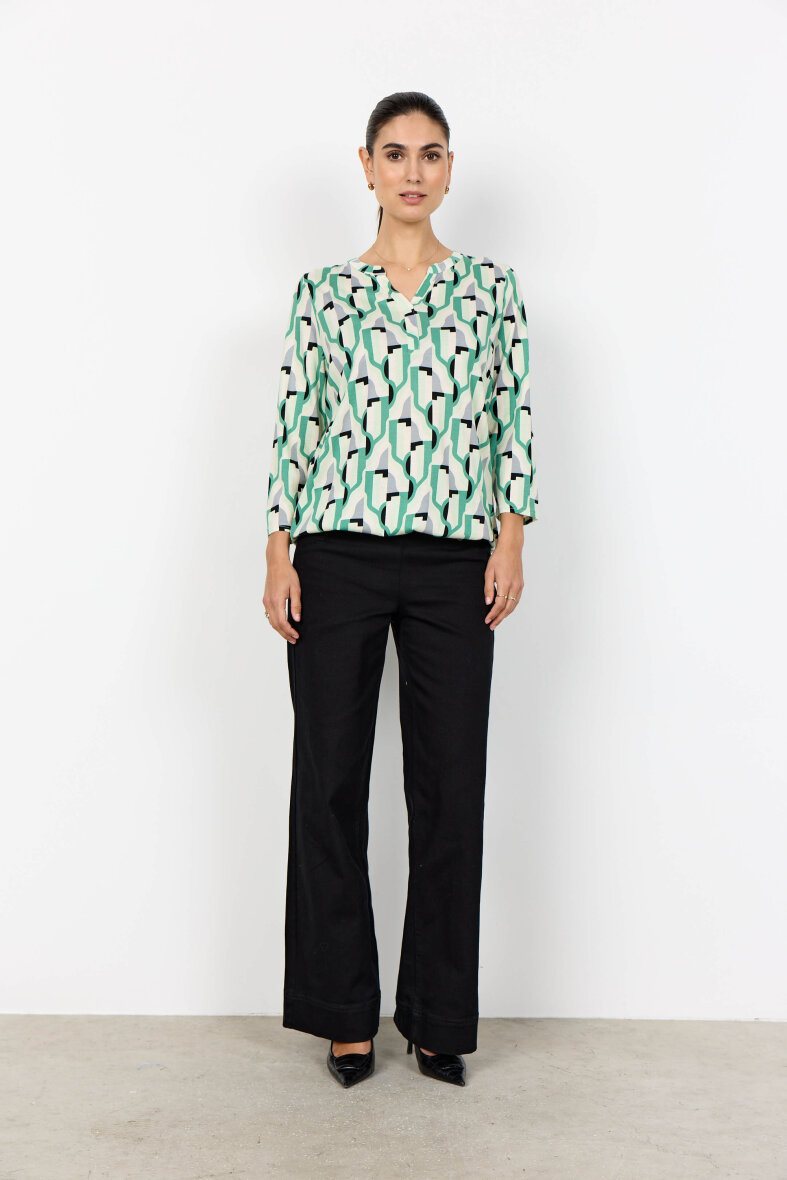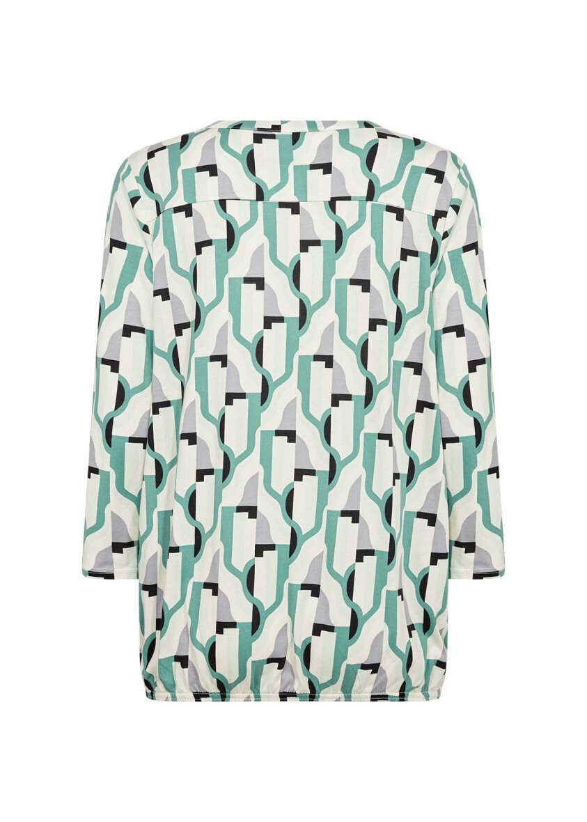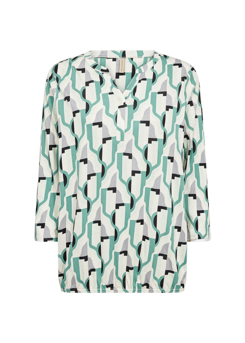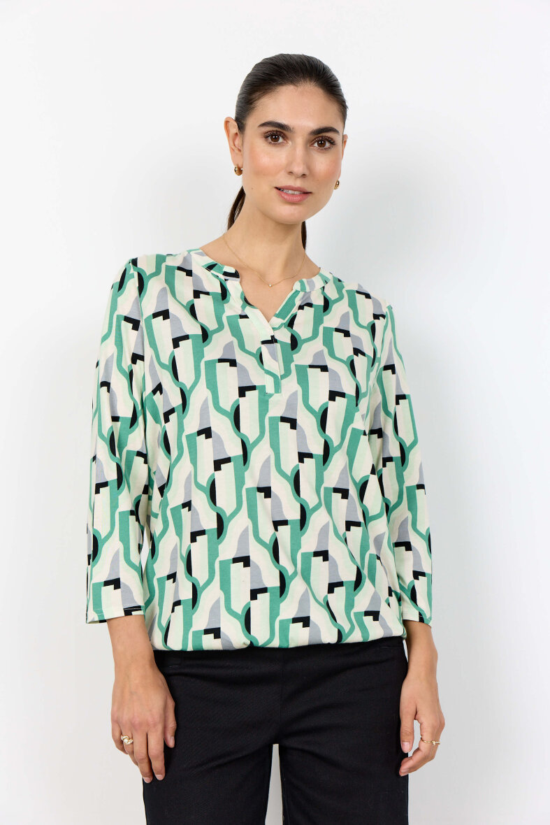 Soyaconcept bluse i et flot grafisk print i grønne og grå nuancer. FELICITY blusen er med v-halsudskæring, stolpeluk og 3/4 lange ærmer.