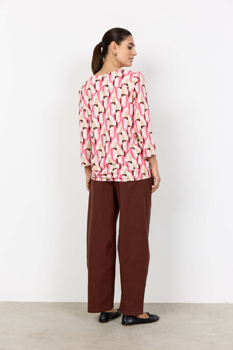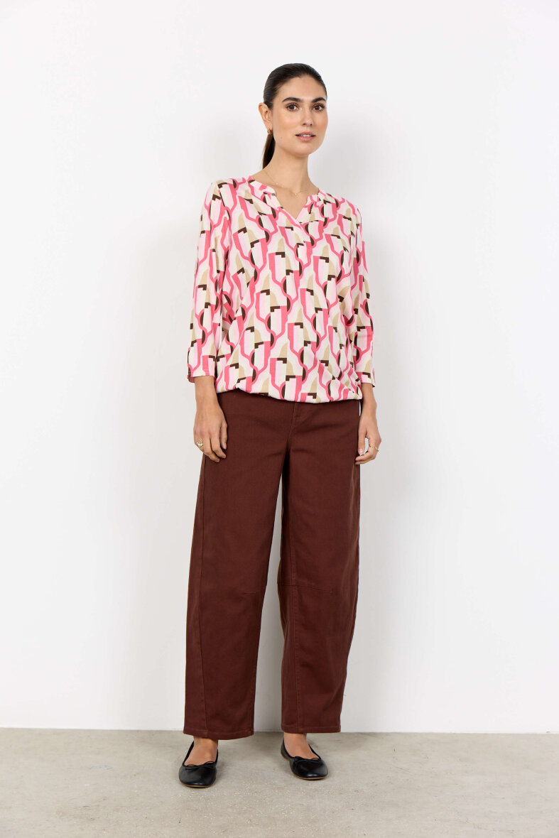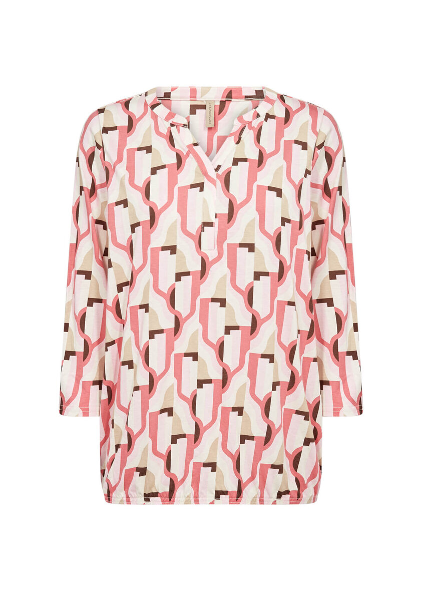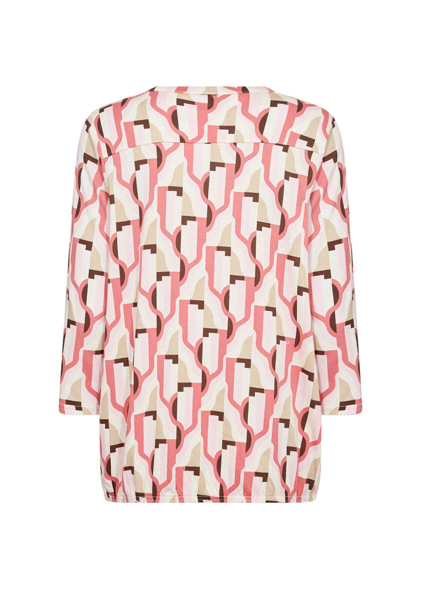 Soyaconcept bluse i et flot grafisk print i lyserød og sandfarvet nuancer. FELICITY blusen er med v-halsudskæring, stolpeluk og 3/4 lange ærmer.