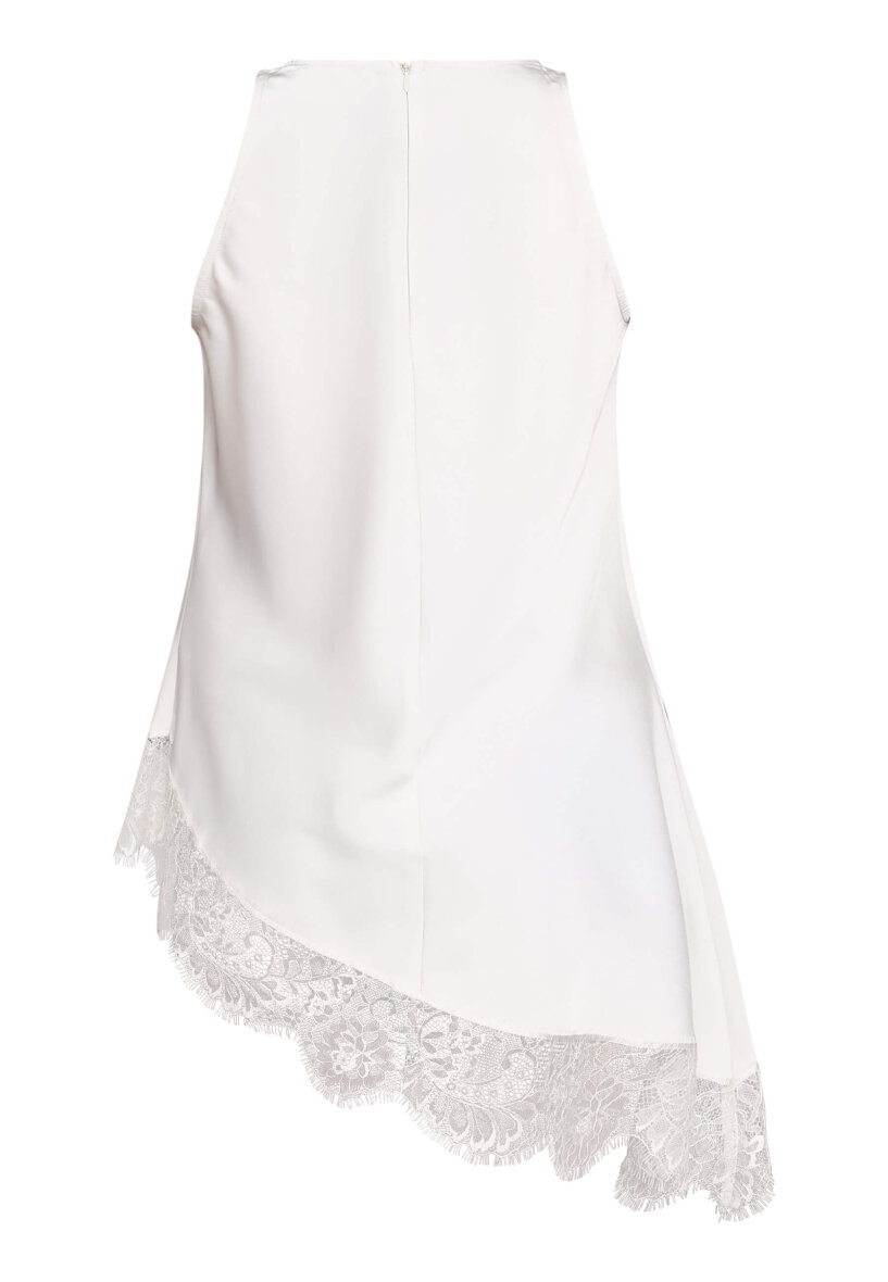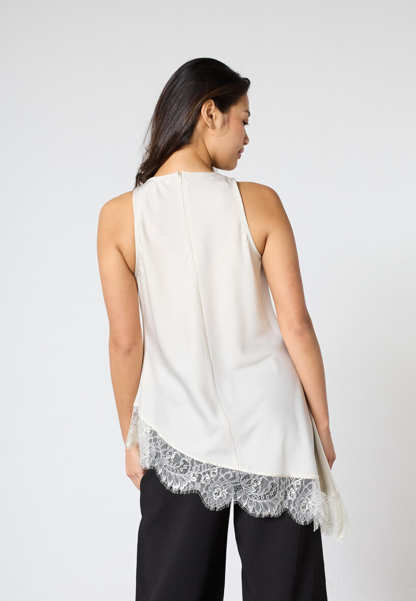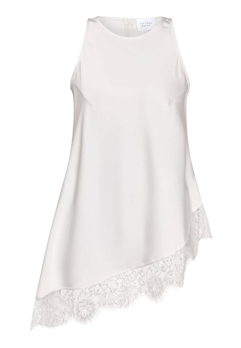 Sisters Point top i en flot alsidig lys cream farve med et moderne blondestykke i den nederste del af toppen. Den er lavet i et glansfuldt, let satinlignende materiale med den asymmetriske underkant med blonder.