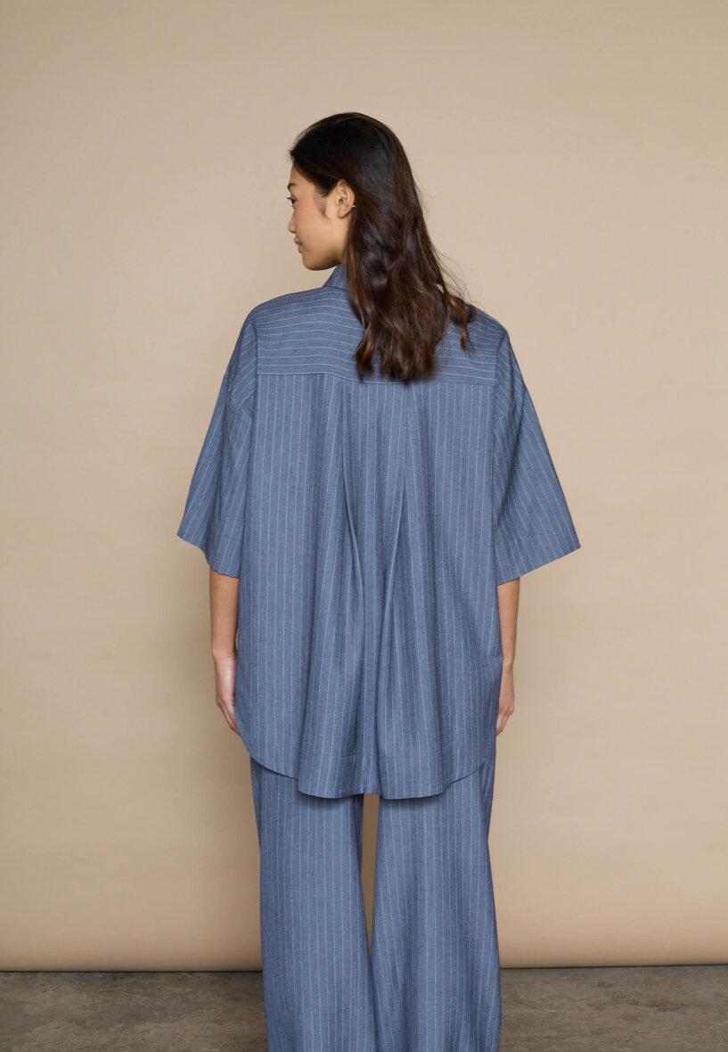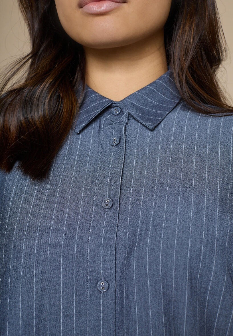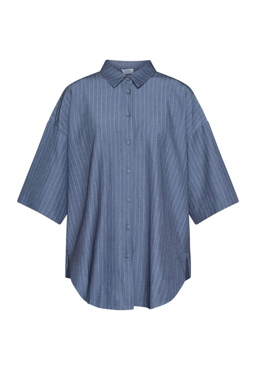 Love & Divine skjorte i en flot blå/grå meleret farve med et moderne nålestribet mønster. Skjorten er lavet i en behagelig oversized pasform, hvor skjorten er en anelse længere bagtil.
