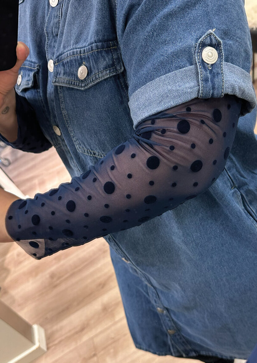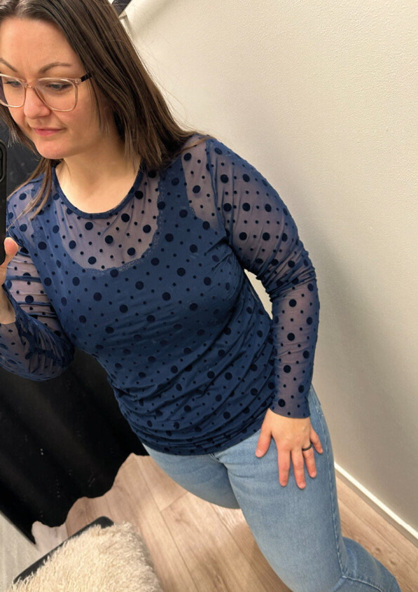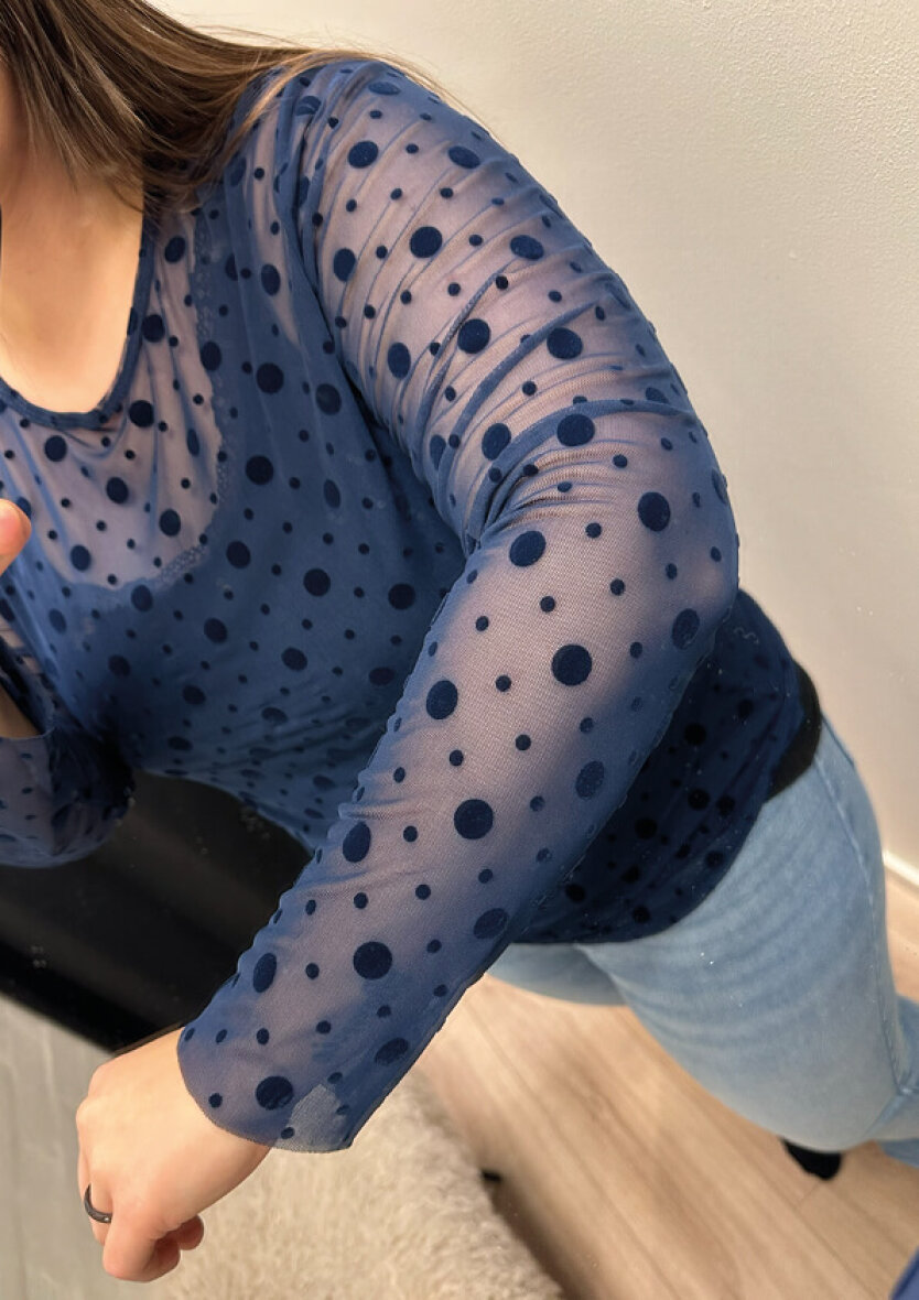 Cassiopeia mesh bluse i en flot blå farve med mørkeblå prikket design. Mesh blusen er med rund hals og lange ærmer.
