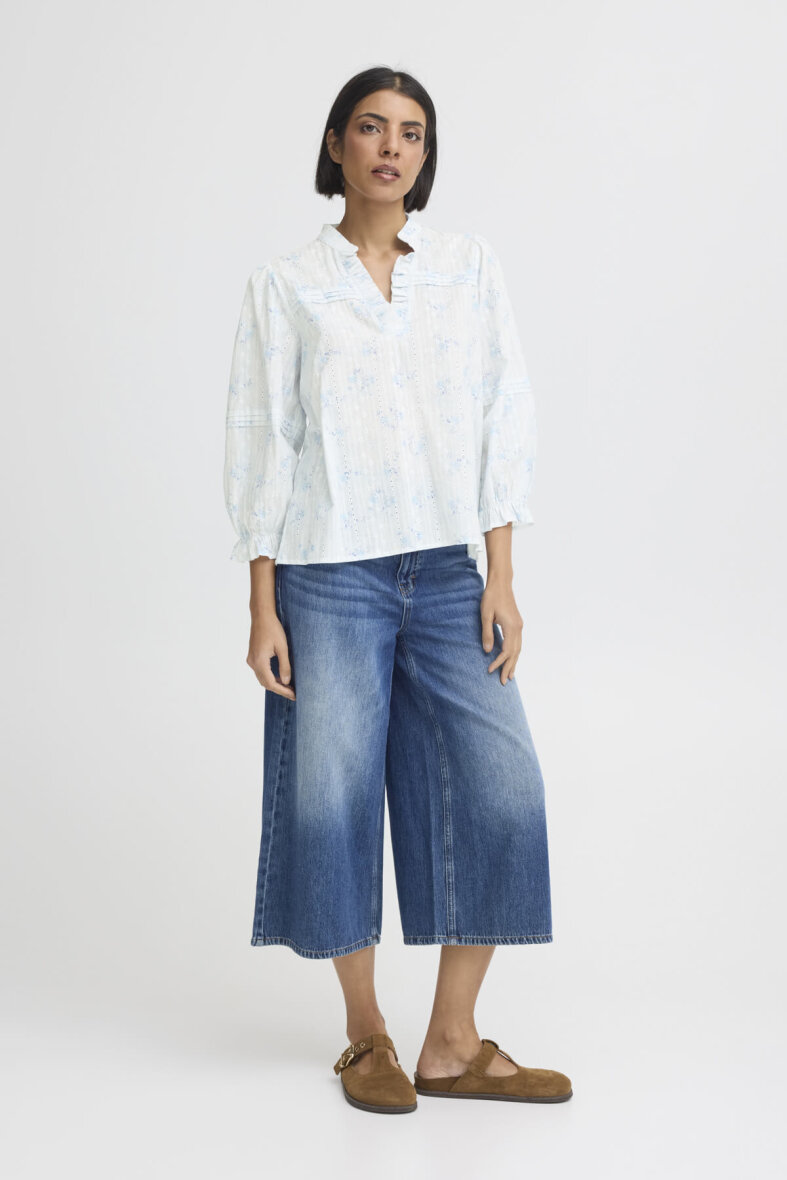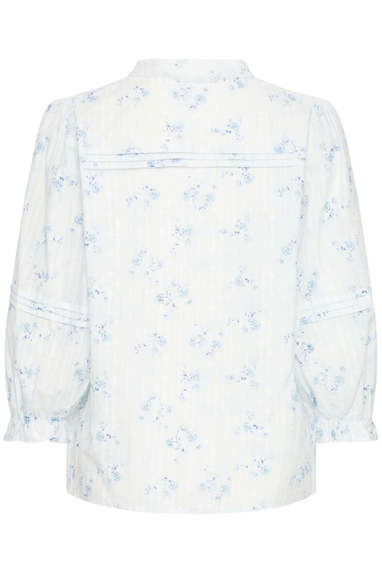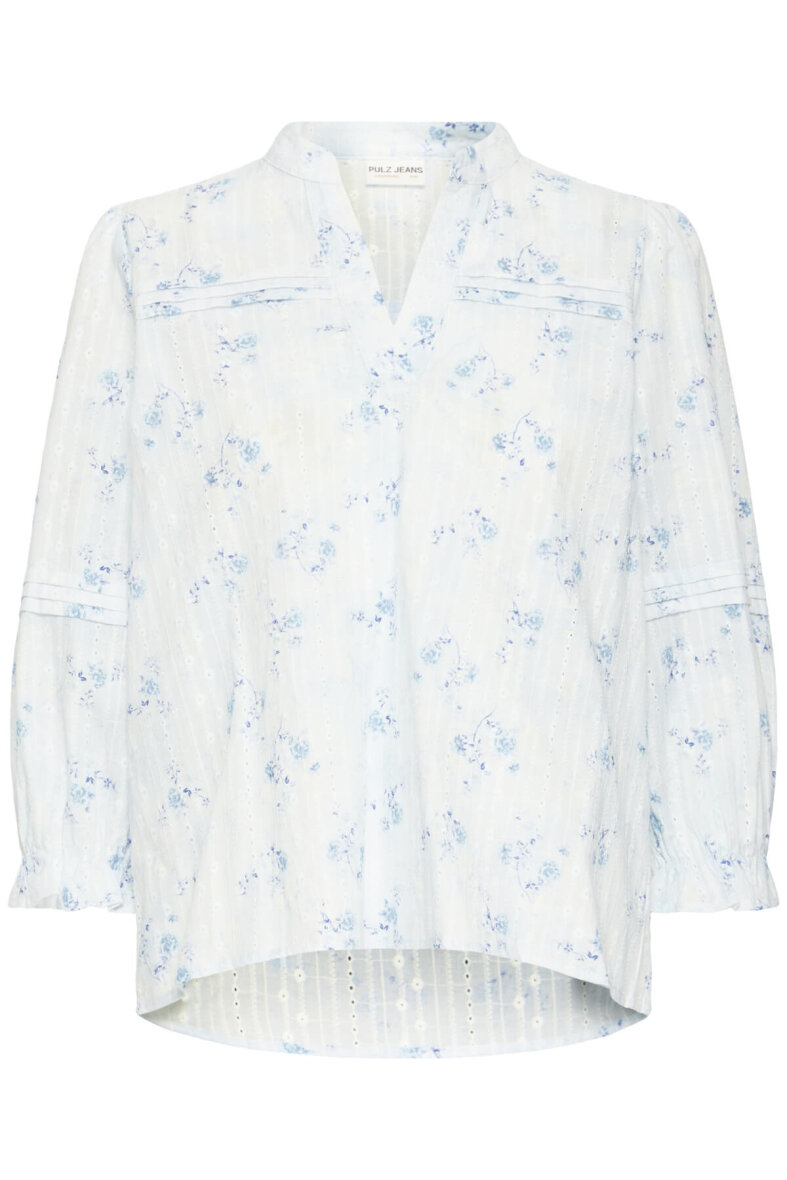 Pulz bluse i en rolig lyseblå farve med diskret blomstret print samt fine og feminine detaljer med striblet syninger, brodering, flæser og hullet mønster. En smuk bluse med flotte detaljer, som kan bruges til både hverdag og festlige anledninger.