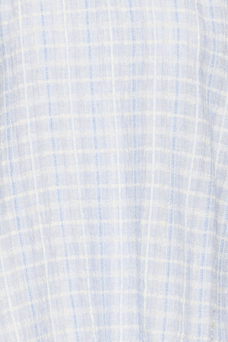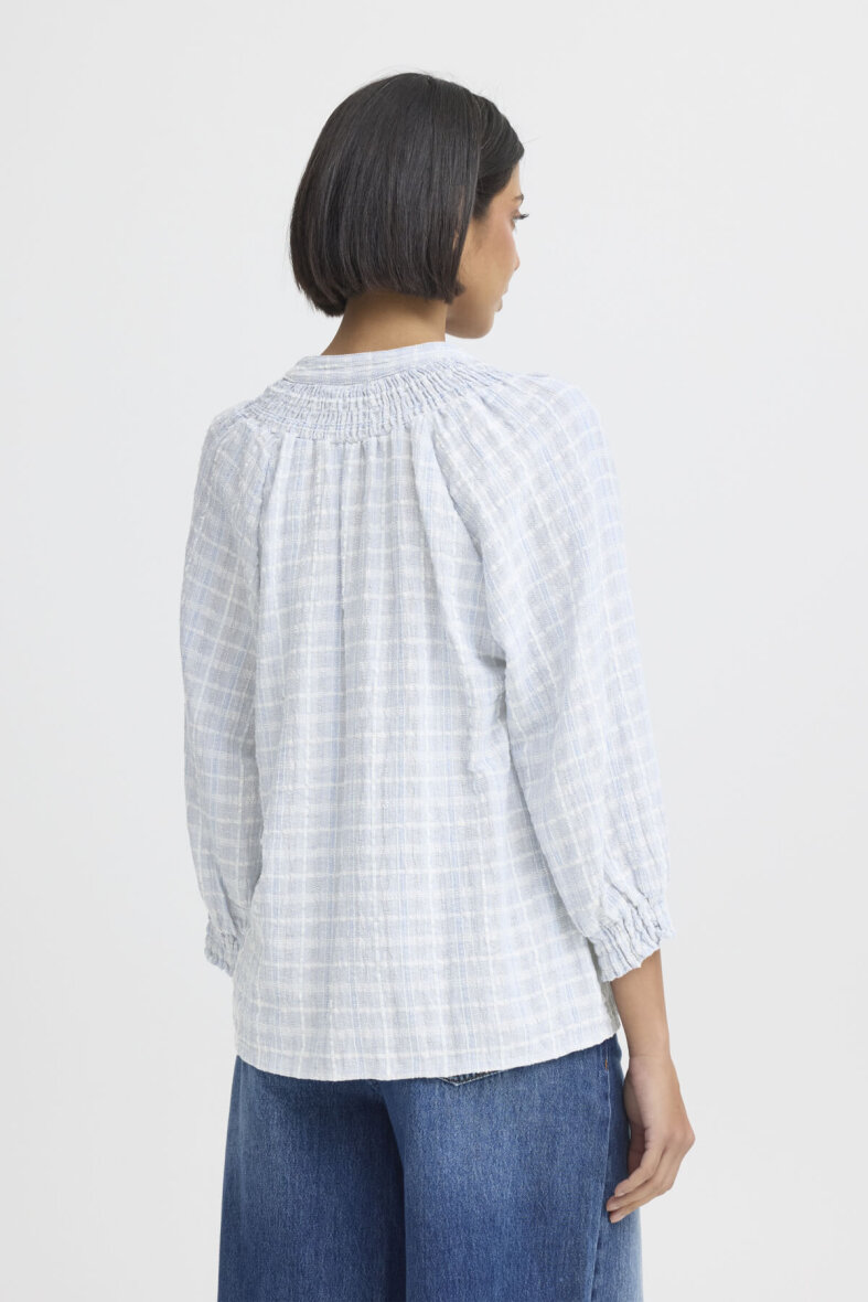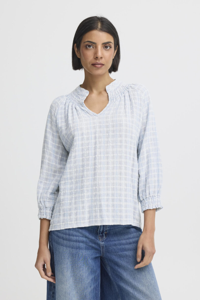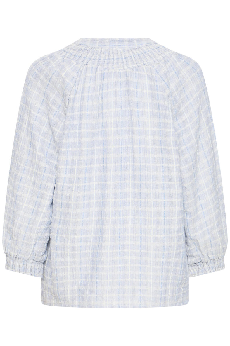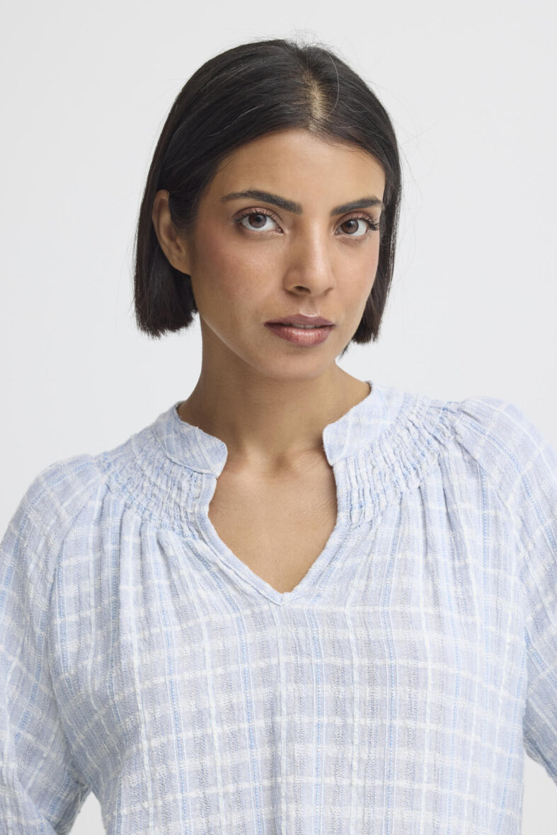 Pulz bluse i en rolig lyseblå farve med diskret ternet mønster med let struktur i stoffet. Baila blusen er med rund hals med smock detaljer og v-halsudskæring.