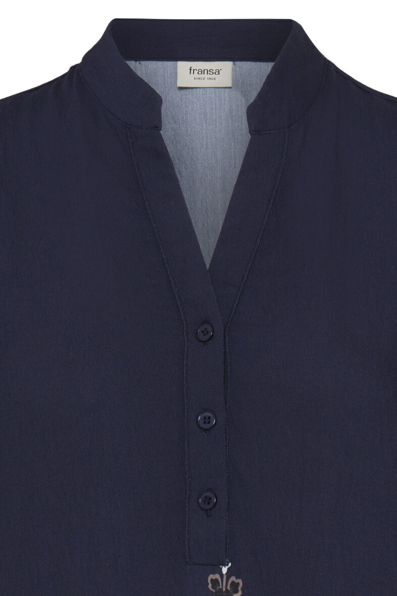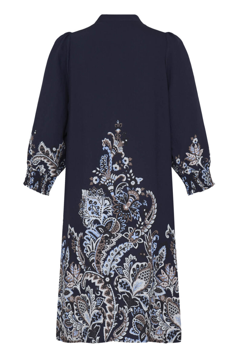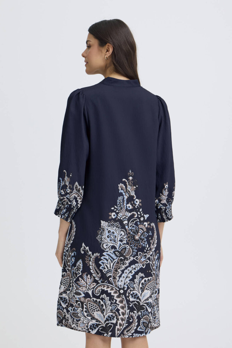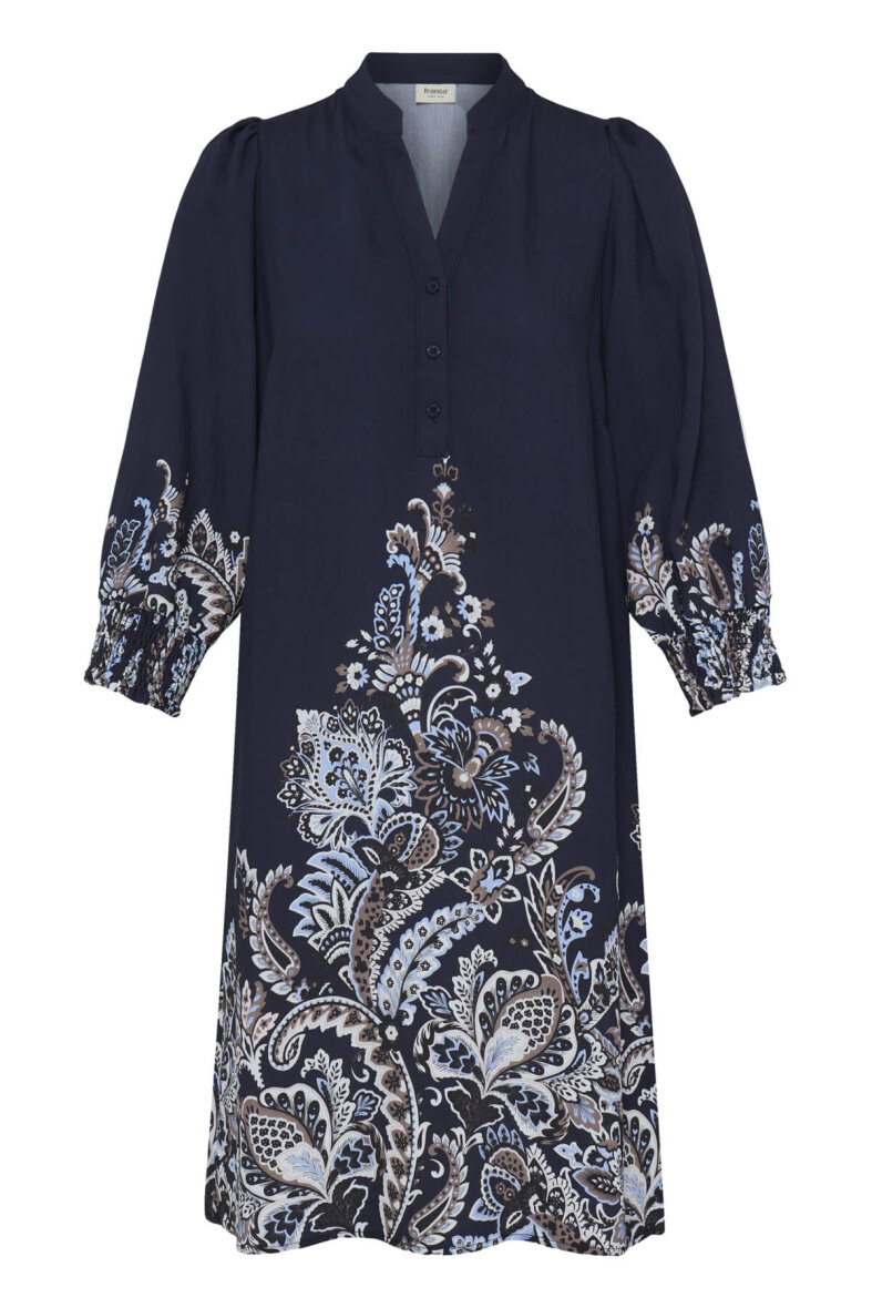 FRANSA kjole i modellen Dara er lavet i en alsidig mørkeblå farve med et fint blomstret print i den nederste del af skørtet og ærmets afslutning.