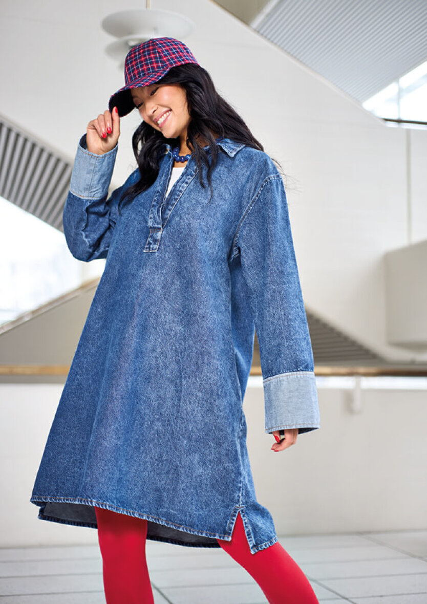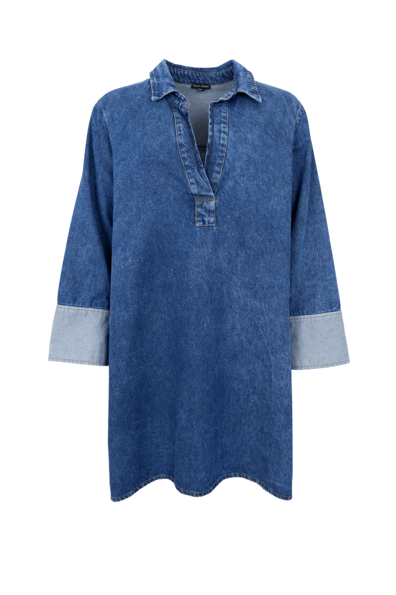Black Colour denimkjole er et stilrent must-have til garderoben. Kjolen har en afslappet, rummelig pasform, der giver masser af komfort, samtidig med at den bevarer et moderne og cool udtryk. Det klassiske medium blå denimlook kombineres med fine detaljer som stolpelukning ved halsen, lange ærmer med kontrastmanchetter i lys denim farve og små slidser i siden, der giver ekstra bevægelighed.