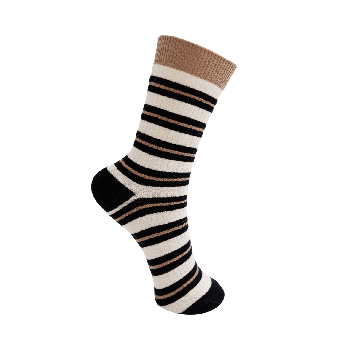 Flotte Black Colour bomuldsstrømper med masser stræk. Strømperne er lavet i et moderne stribet mønster med sand, brune og sorte farver.