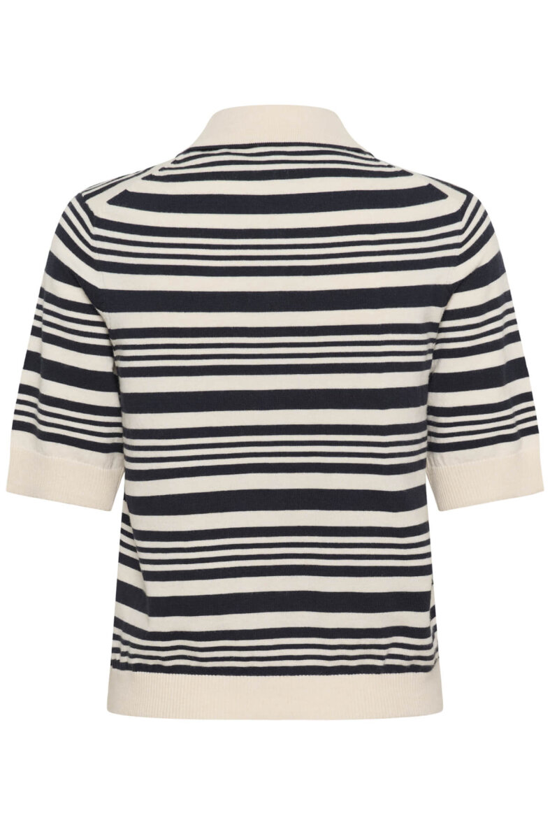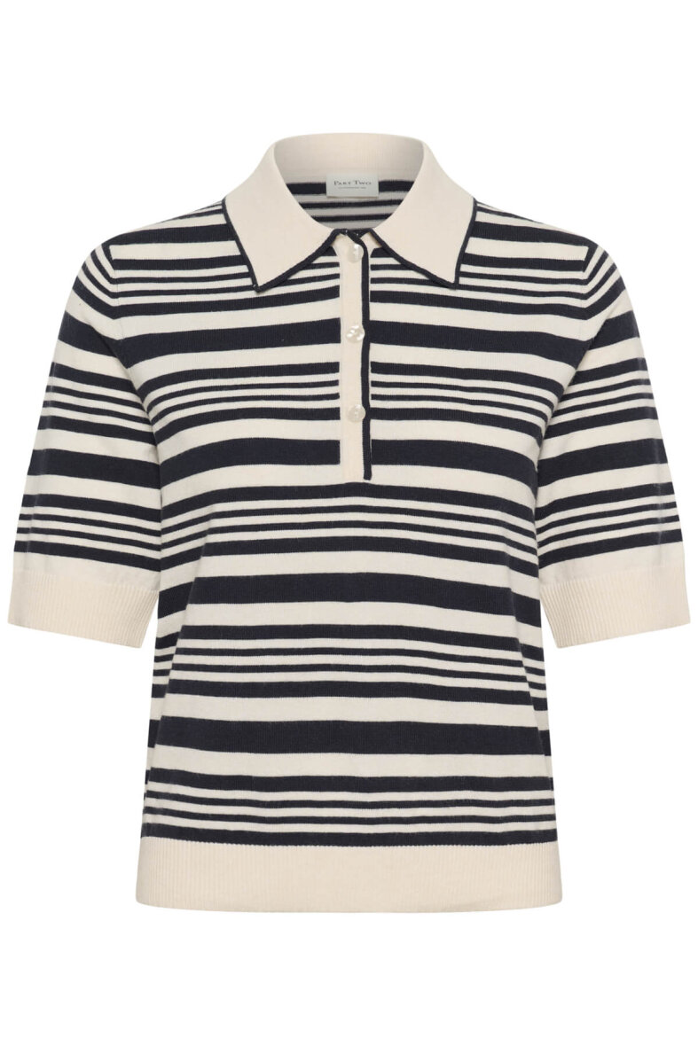 Part Two polo strik i en flot off white farve med navy blå stribet mønster. Poloen er med krave og knapper med stolpeluk foran, hvilket skaber et sporty look. Stikken er med korte ærmer og ribkant ved alle åbninger.