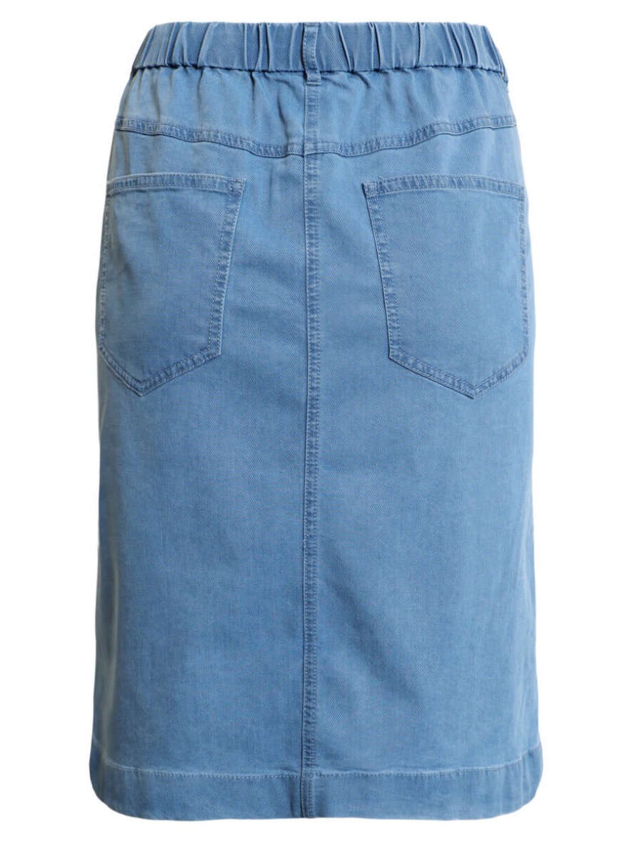 Den knælange nederdel er med elastik i taljen, så den sidder flot og flatterende til. Nederdelen lukkes med knap og lynlås foran og er med bæltestropper og 5 lommer.