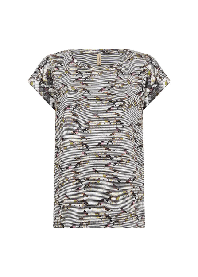 Flot t-shirt fra Soyaconcept i modellen Galina. T-shirten er lavet i et diskret stribet design med grå striber og et flot fugle print i røde og grønne nuancer.