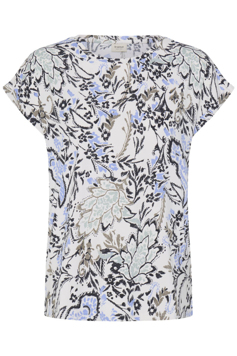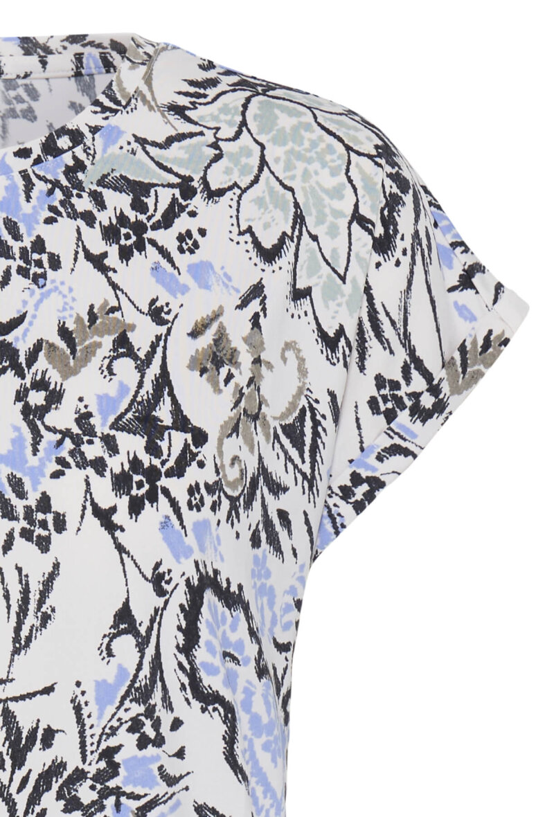 Fransa t-shirt i et flot blomstret print i blå og grønne toner på t-shirtens off white base farve.