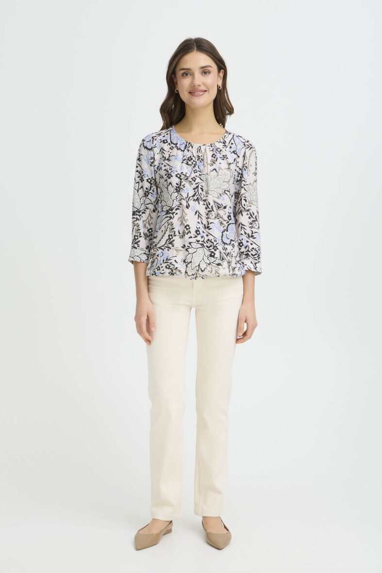 Blusen er med rund hals med rynke detalje, hvilket giver et flot spil i stoffets lette og behagelige kvalitet.