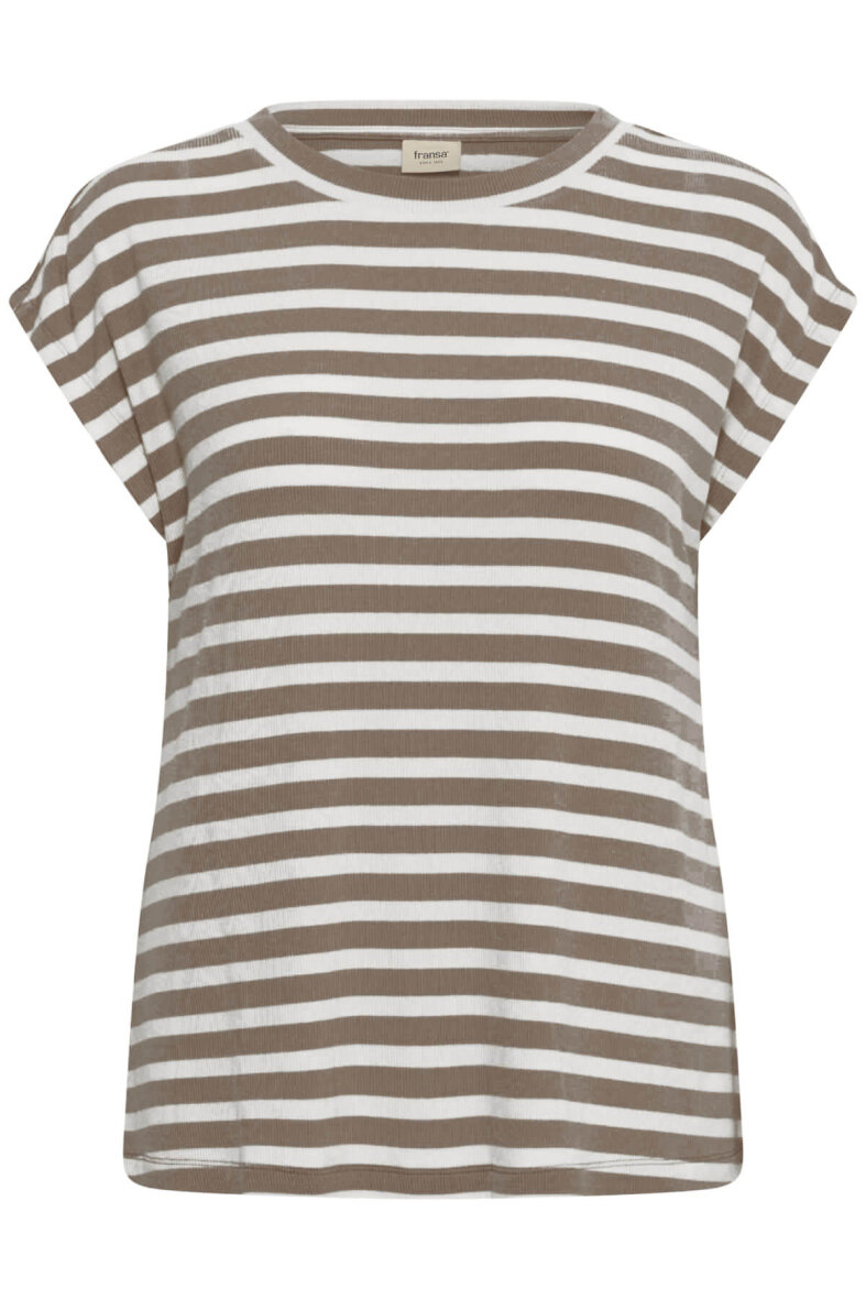 Fransa t-shirt i et moderne stribet design. Blusens enkle design i mørksand og off white striber er et must-have til basis garderoben, da t-shirten er har et hav af stylingsmuligheder.