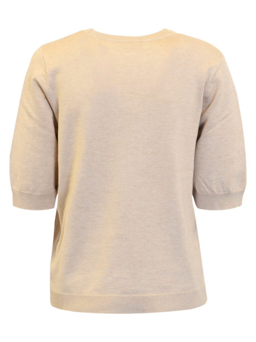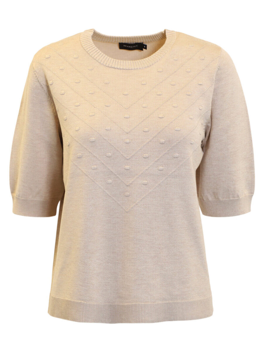 Strikken er med rund hals, korte ærmer og ribkant ved alle åbninger. Striktrøjen er med et diskret vævet mønter med struktur på brystet.