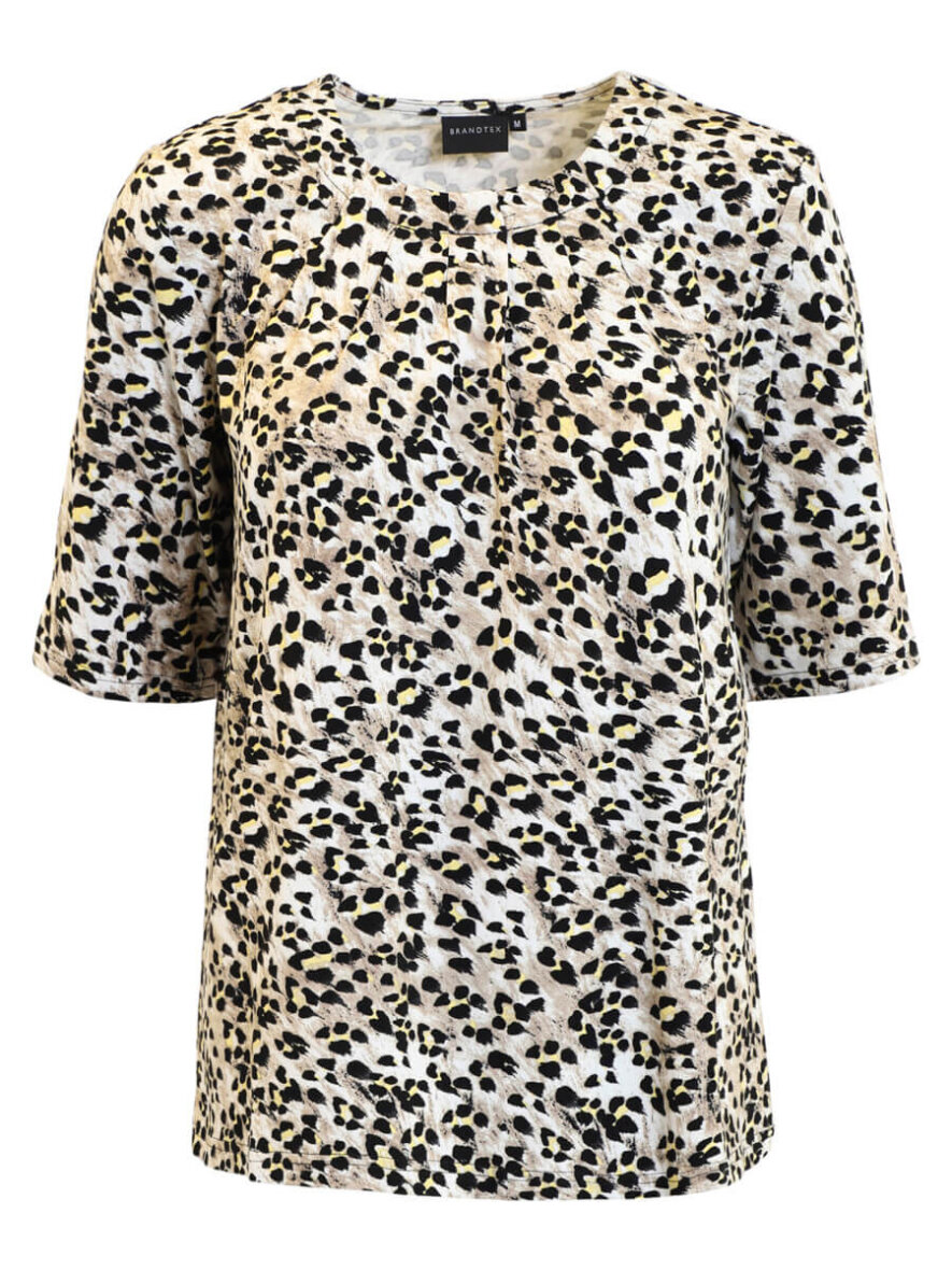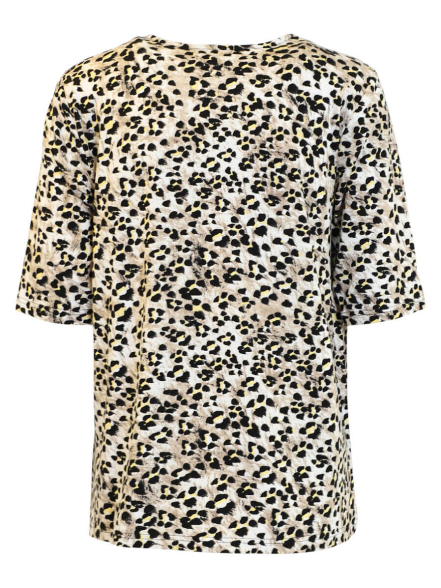 Brandtex t-shirt i et moderne leopard print i sandfarvet nuancer og gule detaljer, som skaber et flot farvespil.
