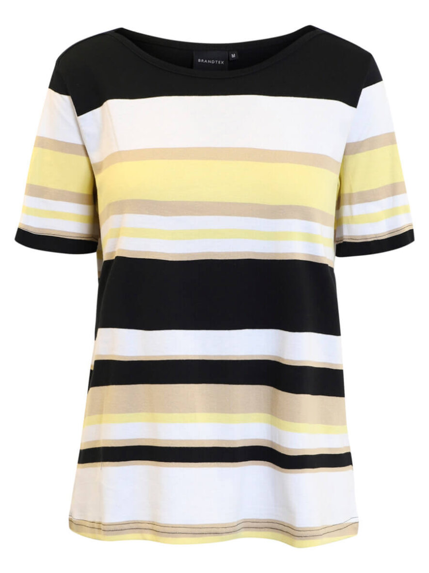 Brandtex t-shirt i et moderne stribet mønster i gul, sort og brun og cremefarvet striber. T-shirten er med rund hals og korte ærmer.