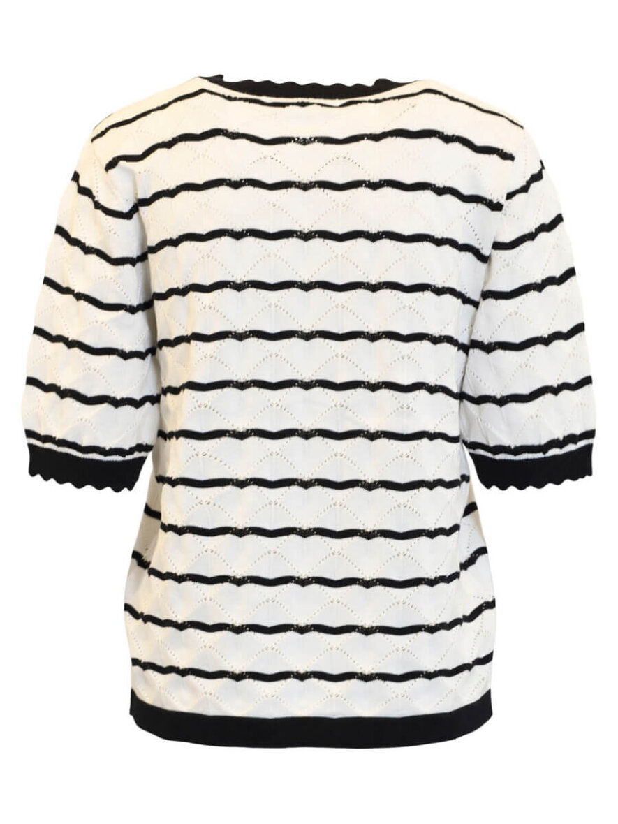 Brandtex strik t-shirt i en alsidig off white farve med sort stribet mønster og sort kontrastkant ved alle åbninger, som er med til at fuldende designet.
