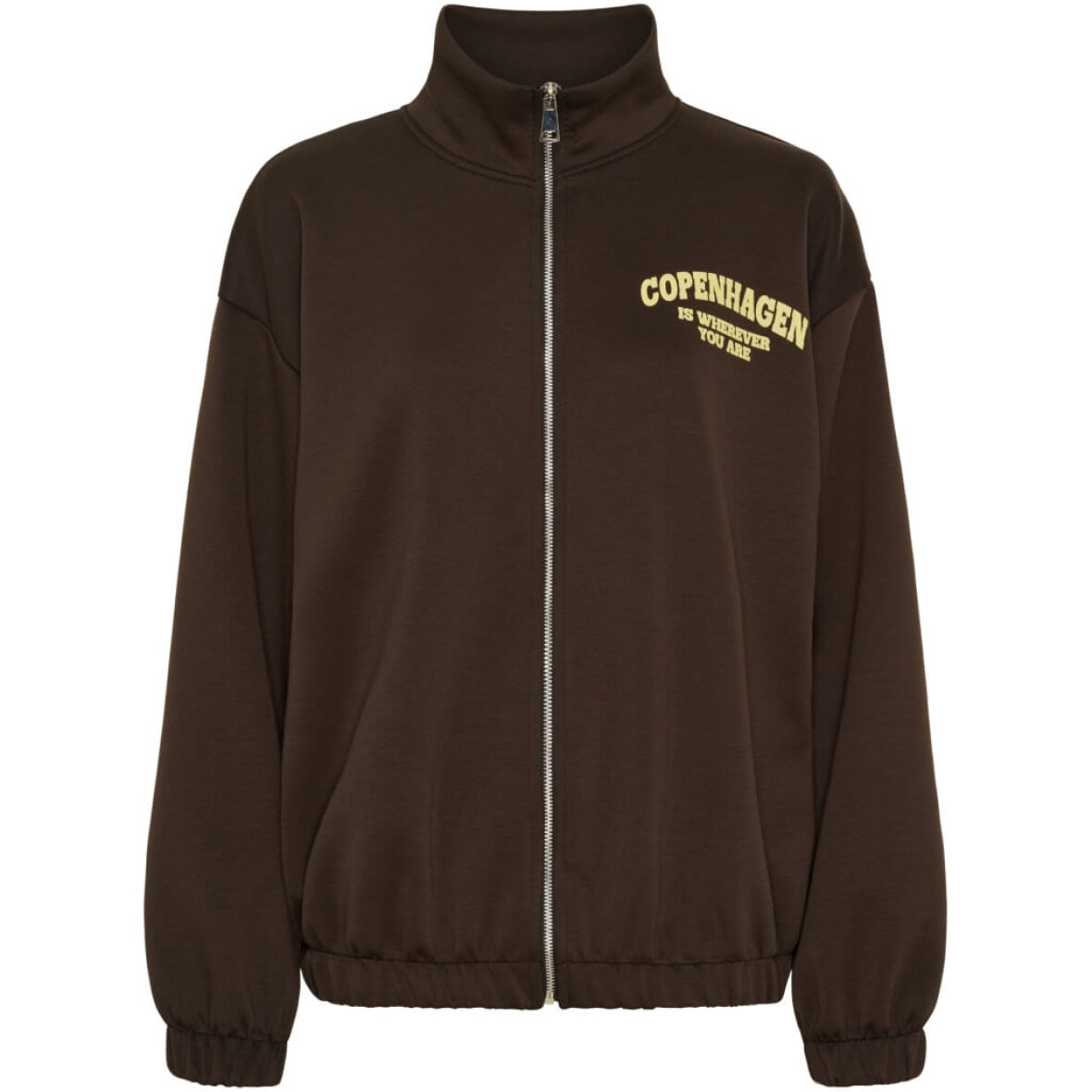Marta Du Chateau sweatshirt i en moderne mørkebrun farve med et iøjefaldende gult tryk på blusens ryg med blokbokstaver fra hvert ærmer der danner ordet "Copenhagen".