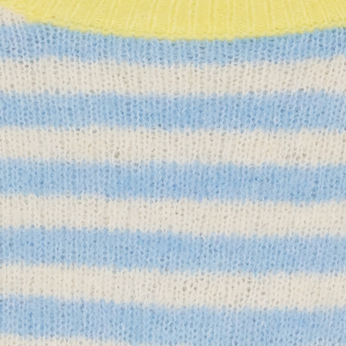 Marta Du Chateau striktrøje i en flot stribet mønster i lyseblå og sandfarvet striber. Designet fuldendes med den iøjefaldende gule kontrastkant ved alle åbninger.